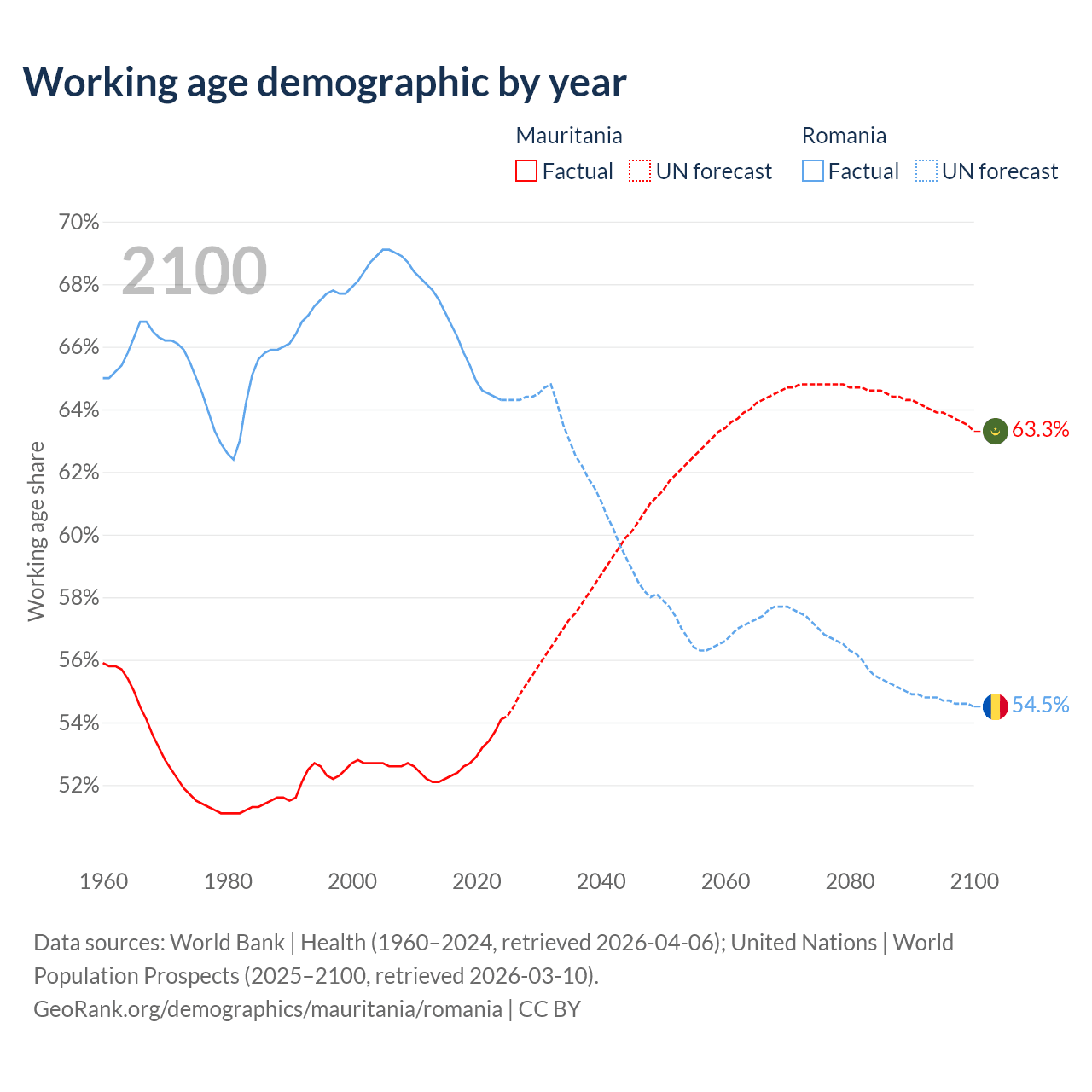 - Mauritania has 2.98M working age adults (aged 15-64) vs 12.1M in Romania.