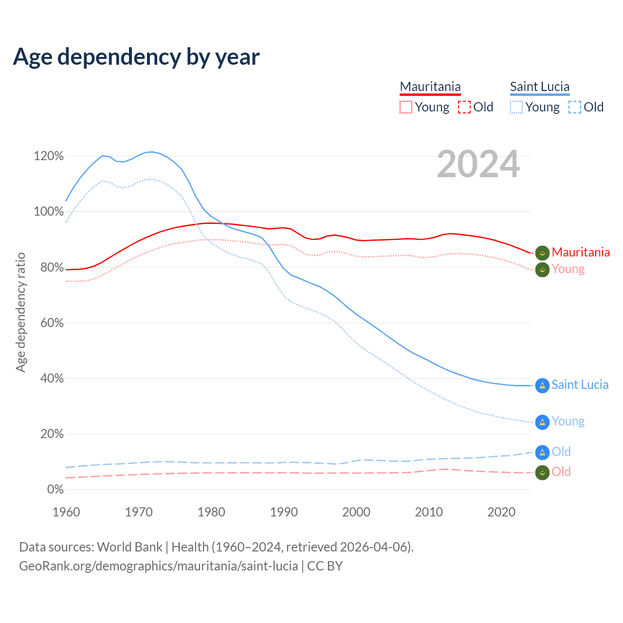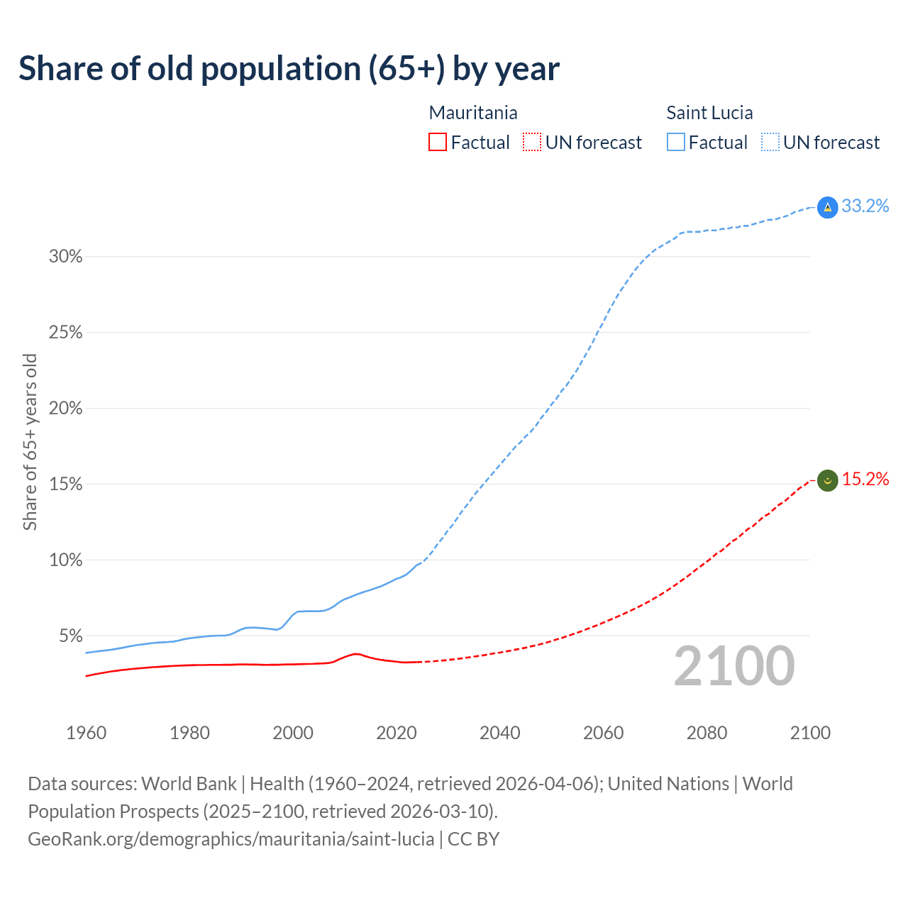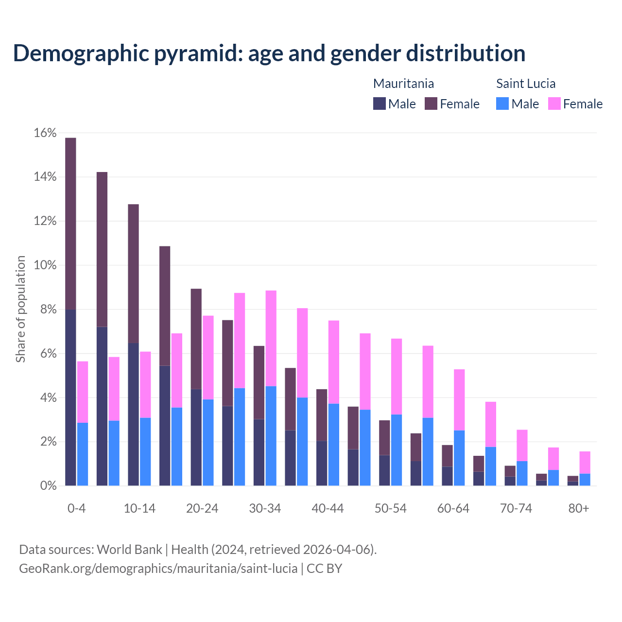 - The share of old-age demographic (65+) in Mauritania is 3.23% vs 9.62% in Saint Lucia.