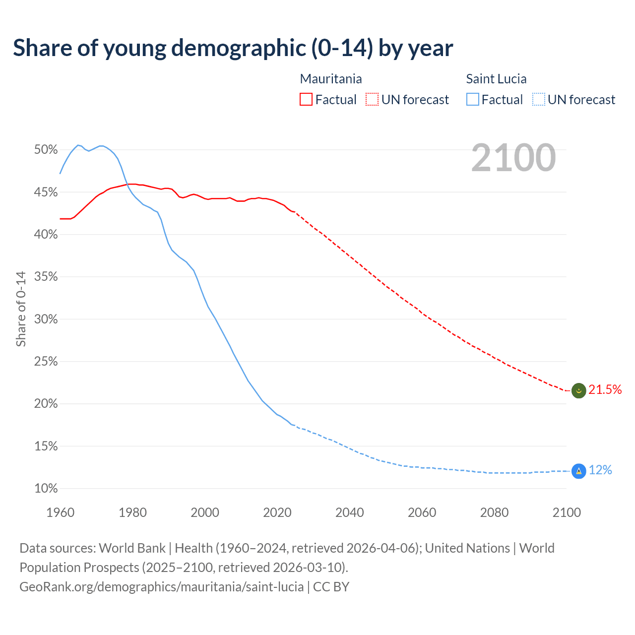 - The share of young demographic (0-15 years old) in Mauritania is 42.7% vs 17.5% in Saint Lucia.