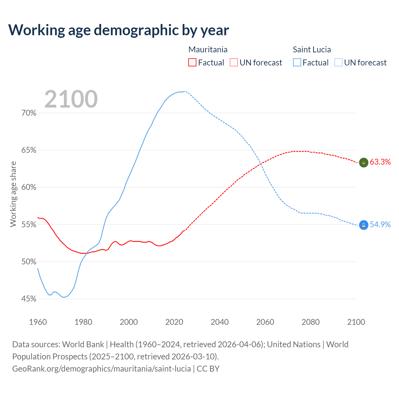 - Mauritania has 2.98M working age adults (aged 15-64) vs 132K in Saint Lucia.