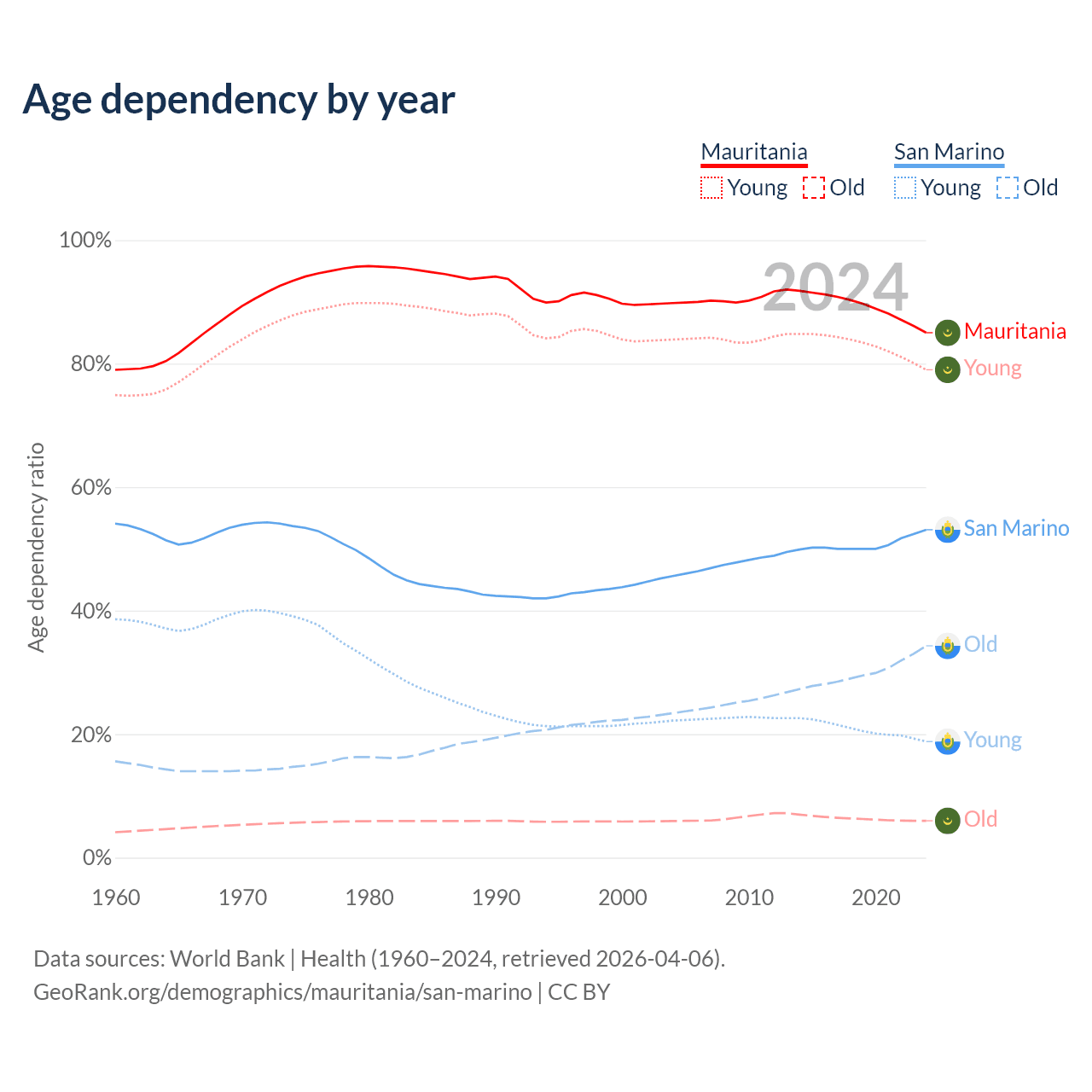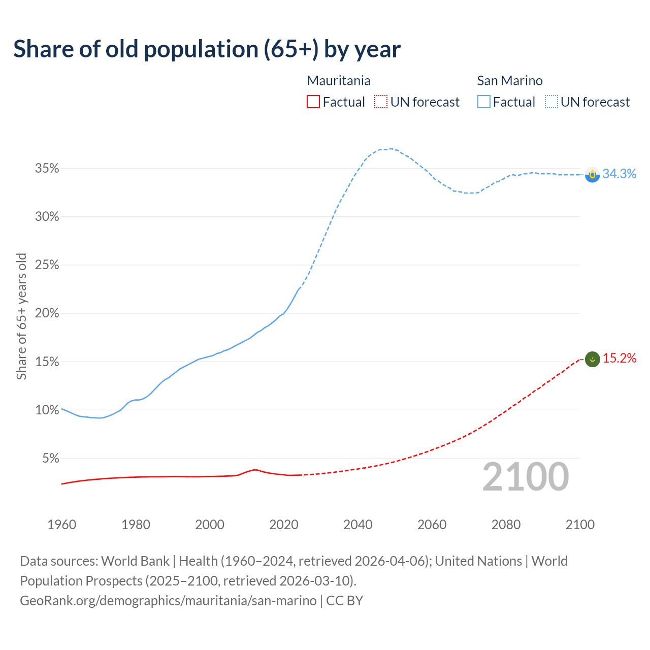 - The share of old-age demographic (65+) in Mauritania is 3.23% vs 22.4% in San Marino.
