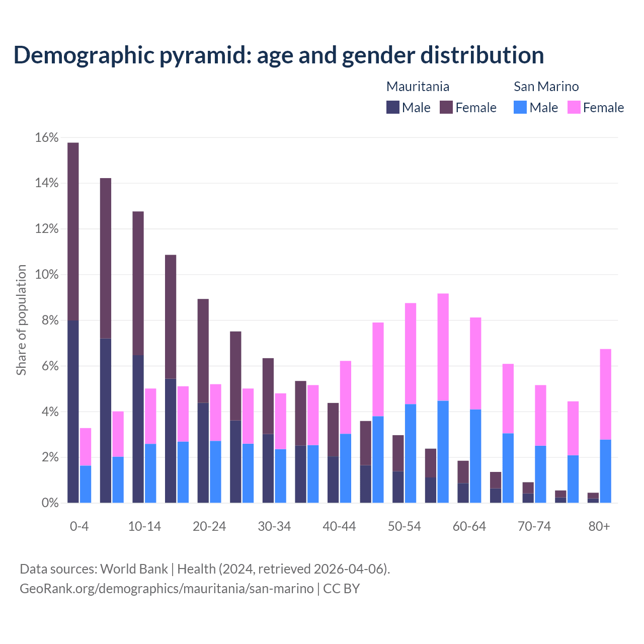 - The share of young demographic (0-15 years old) in Mauritania is 42.7% vs 12.3% in San Marino.