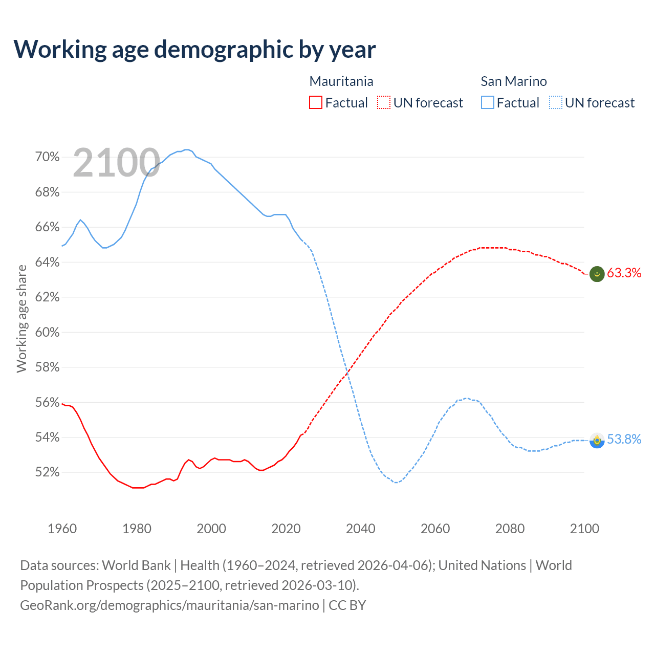 - Mauritania has 2.98M working age adults (aged 15-64) vs 22.2K in San Marino.