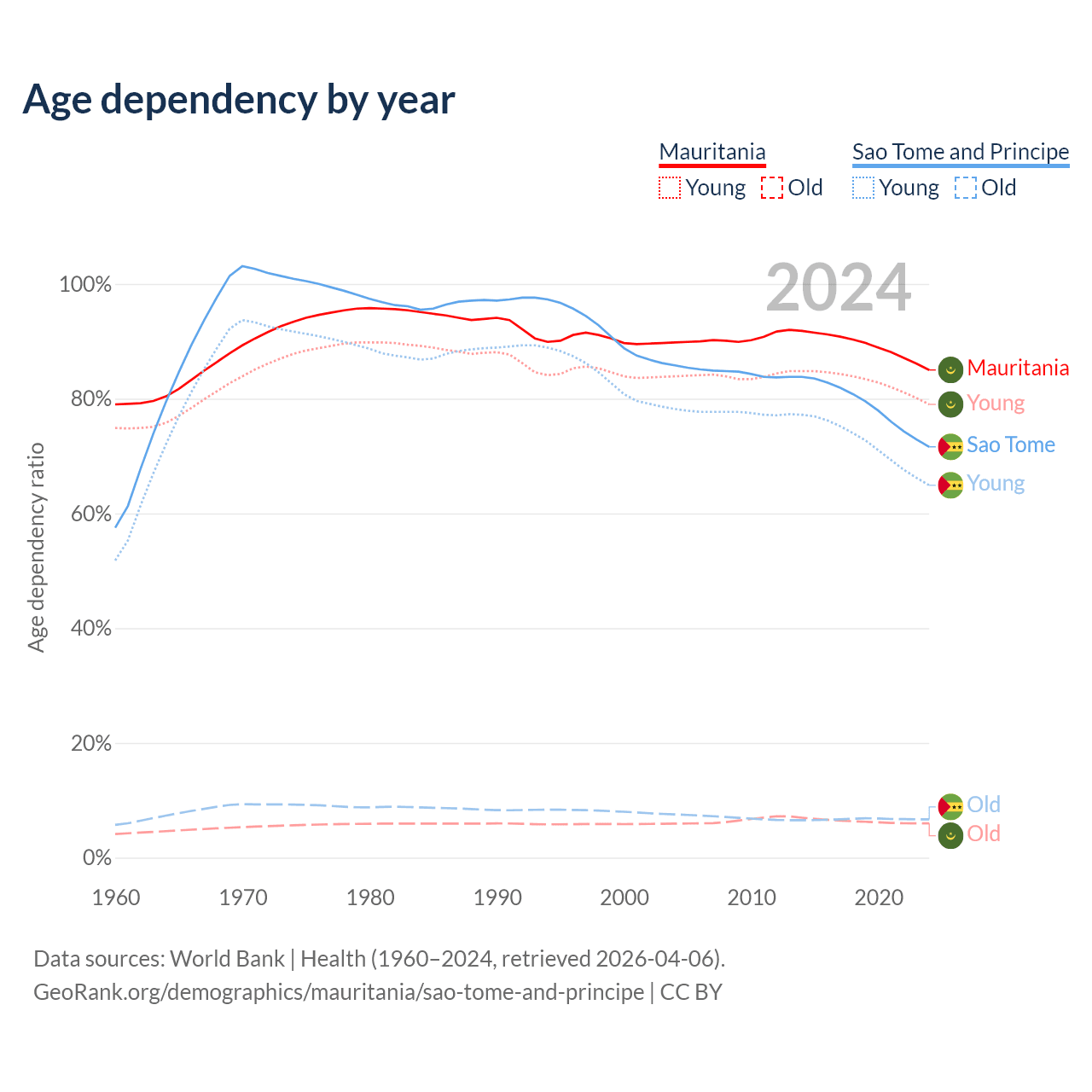 - Mauritania is ranked 185/196 by median age (oldest to youngest) vs 163/196 for Sao Tome and Principe.