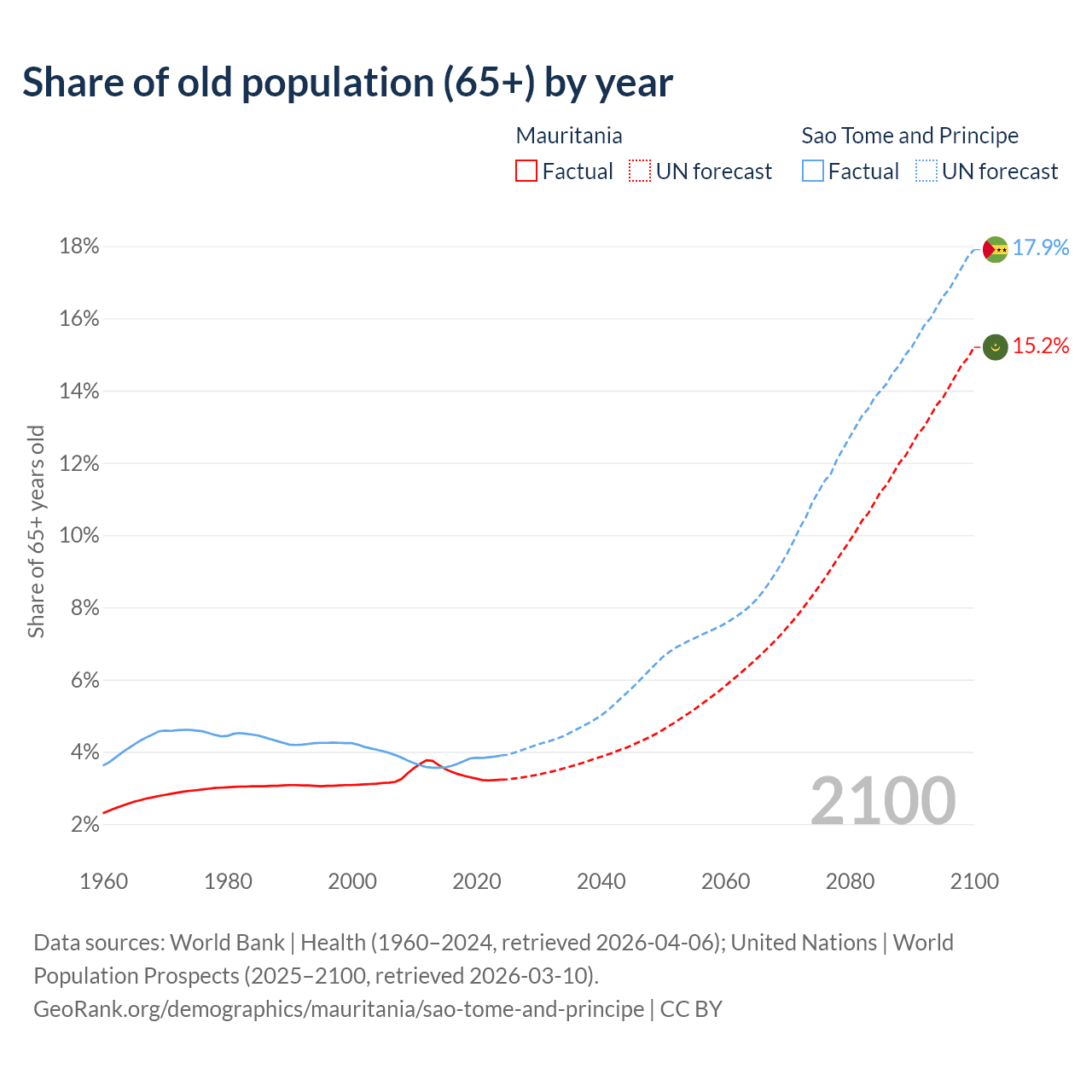 The share of older people aged 65 and over is 3.23% in Mauritania and 3.9% in Sao Tome and Principe. Life expectancy in Mauritania compared to Sao Tome and Principe .