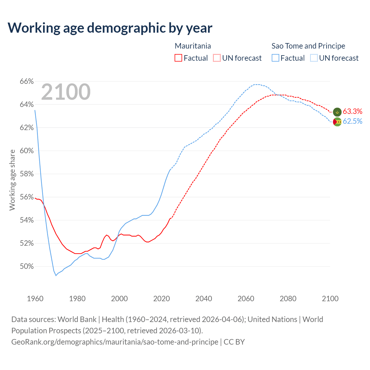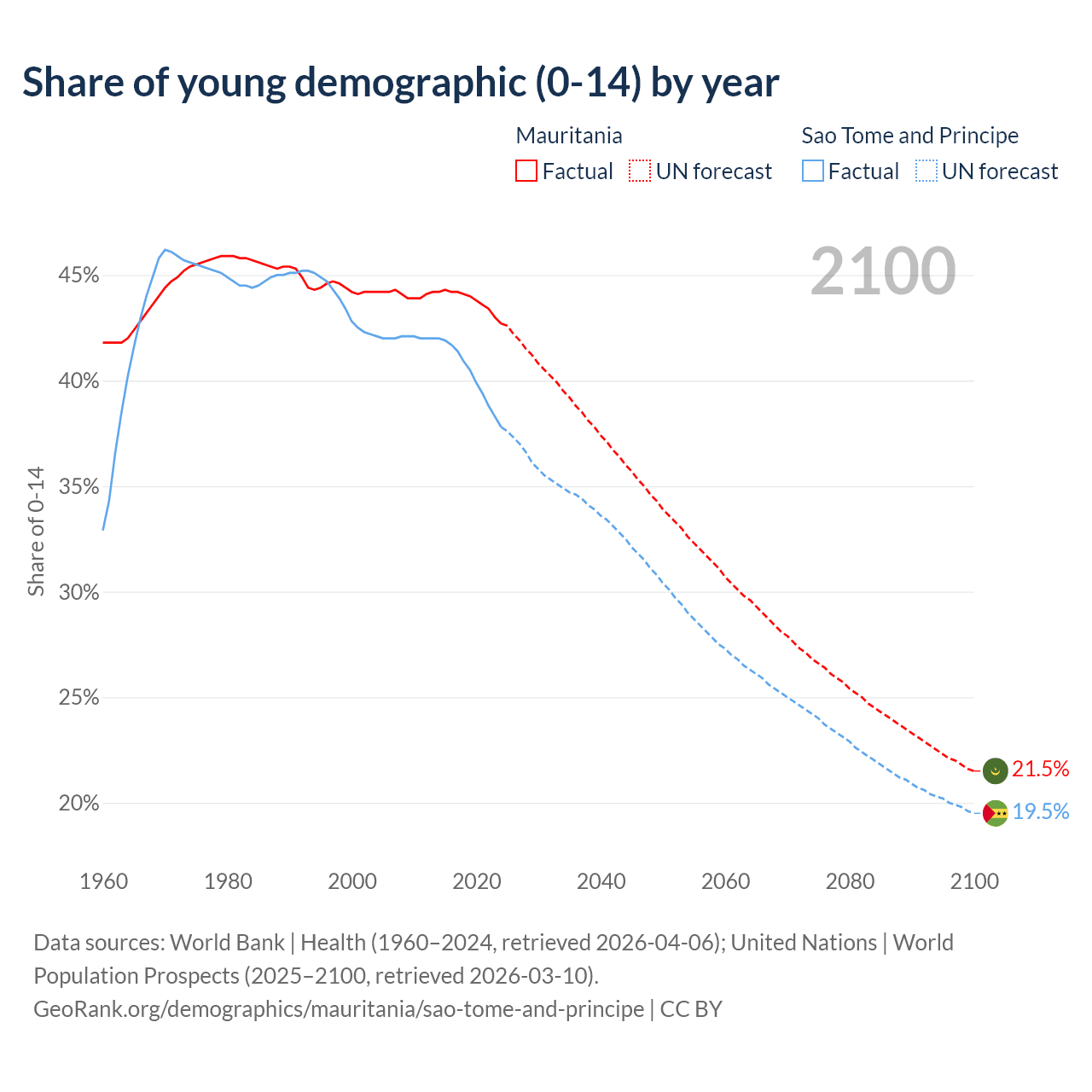 Median age Mauritania vs Sao Tome and Principe, 1960-2100