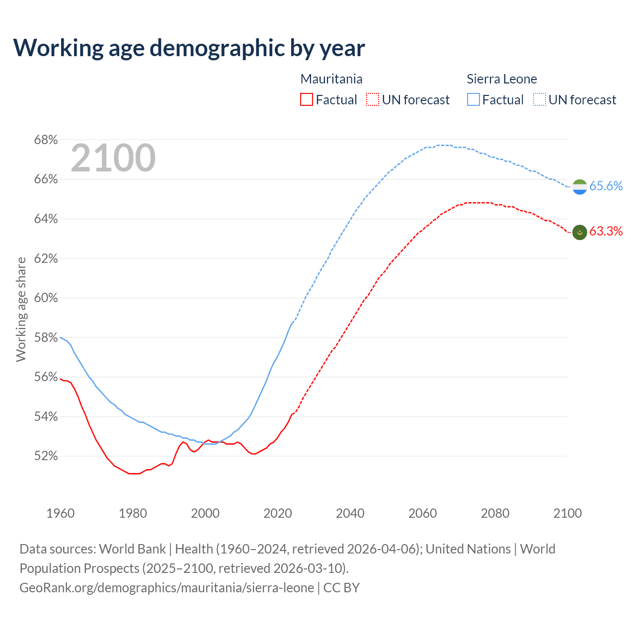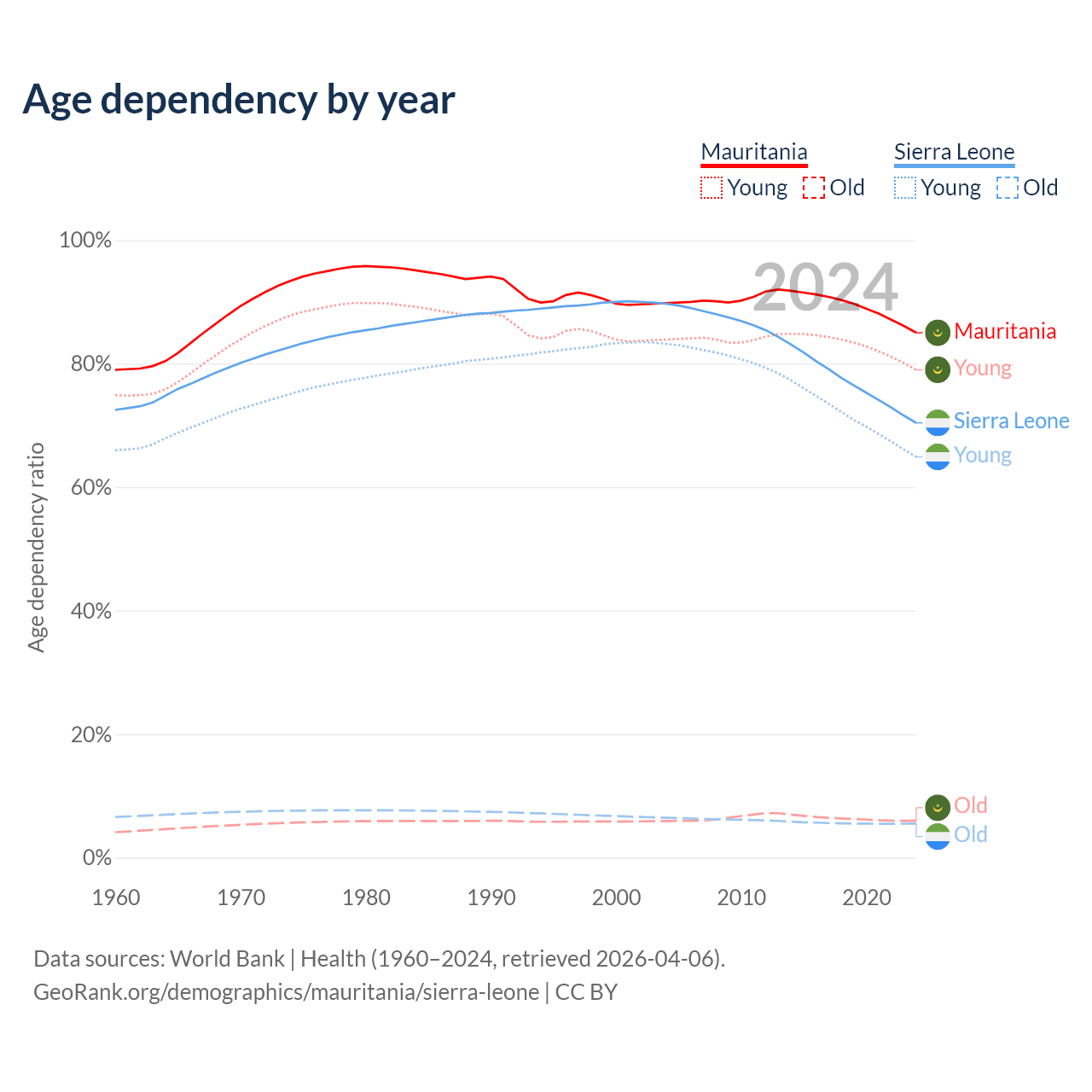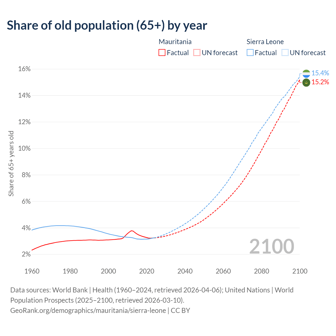 - The share of old-age demographic (65+) in Mauritania is 3.23% vs 3.24% in Sierra Leone.