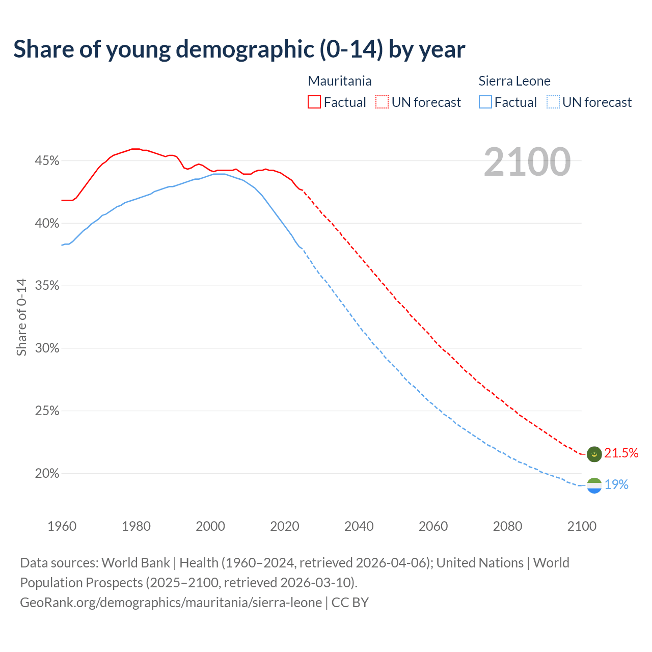 - The share of young demographic (0-15 years old) in Mauritania is 42.7% vs 38.1% in Sierra Leone.