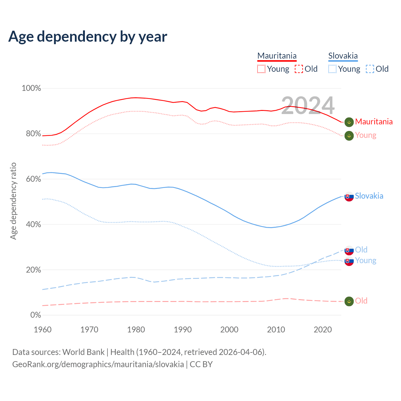 - The share of old-age demographic (65+) in Mauritania is 3.23% vs 18.5% in Slovakia.