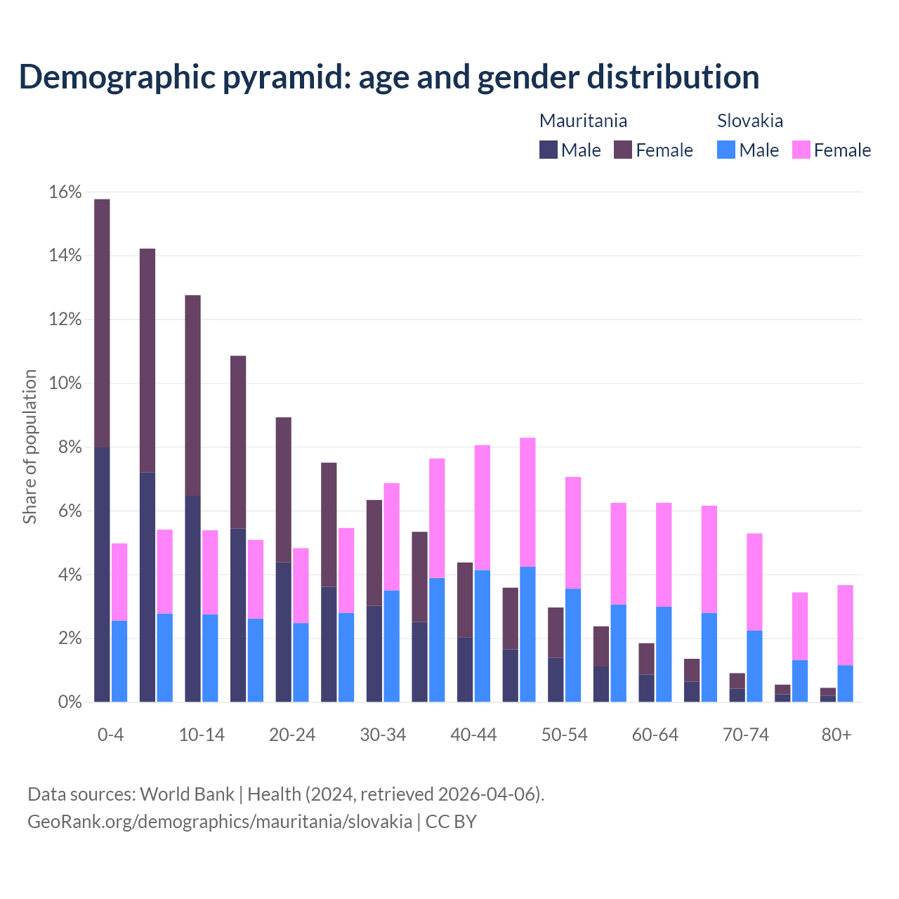 - The share of young demographic (0-15 years old) in Mauritania is 42.7% vs 15.8% in Slovakia.