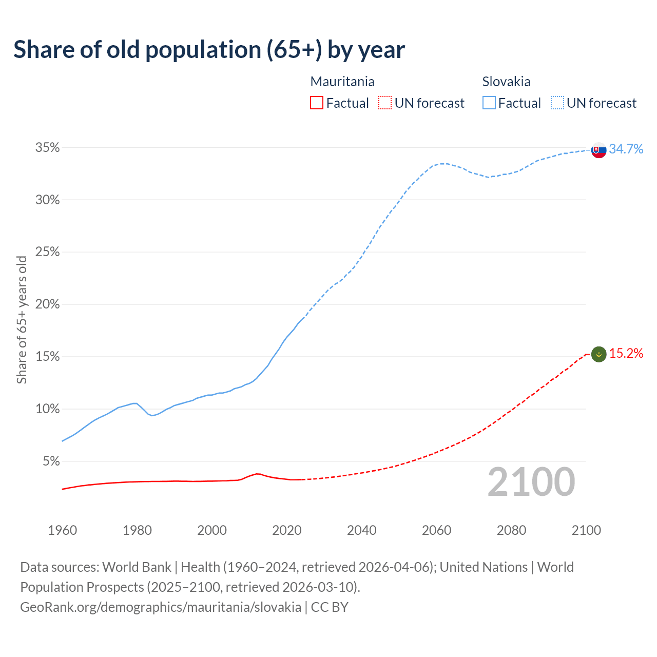 The share of older people aged 65 and over is 3.23% in Mauritania and 18.5% in Slovakia. Life expectancy in Mauritania compared to Slovakia .