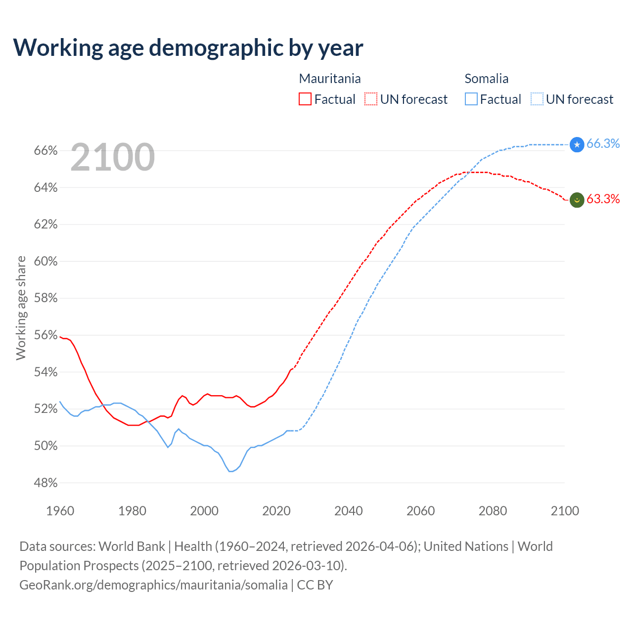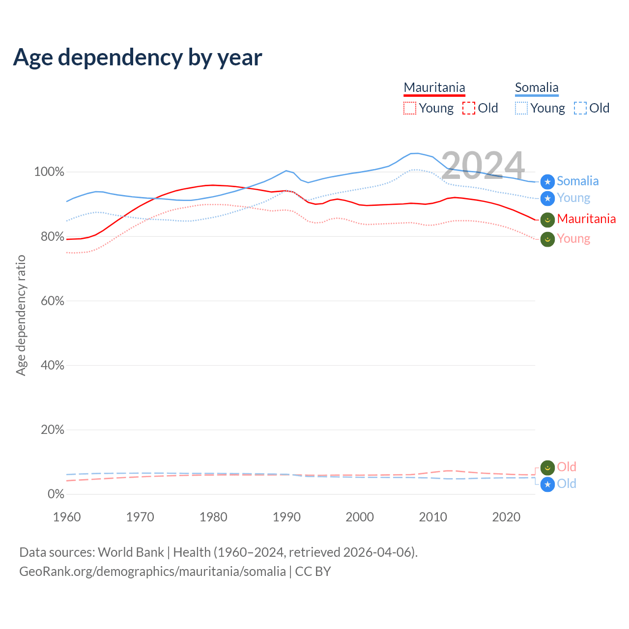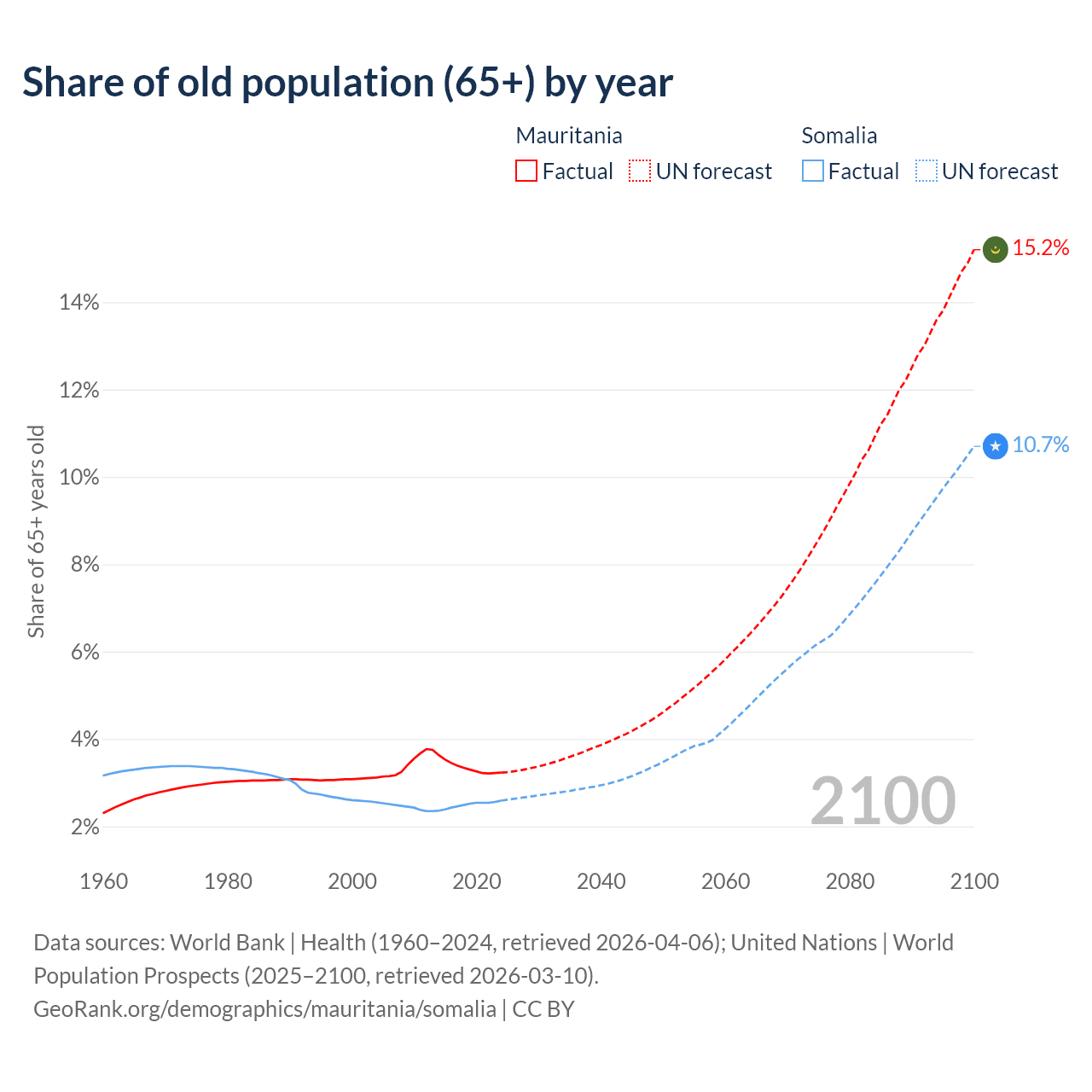 - The share of old-age demographic (65+) in Mauritania is 3.23% vs 2.59% in Somalia.