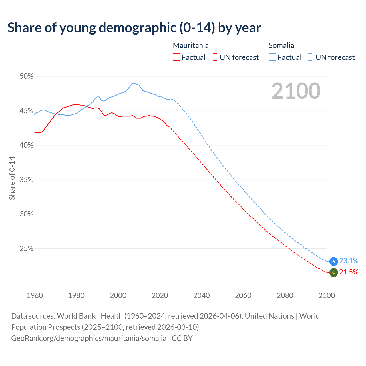- The share of young demographic (0-15 years old) in Mauritania is 42.7% vs 46.6% in Somalia.