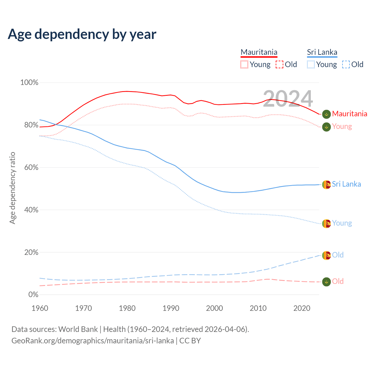 - The share of old-age demographic (65+) in Mauritania is 3.23% vs 12.1% in Sri Lanka.