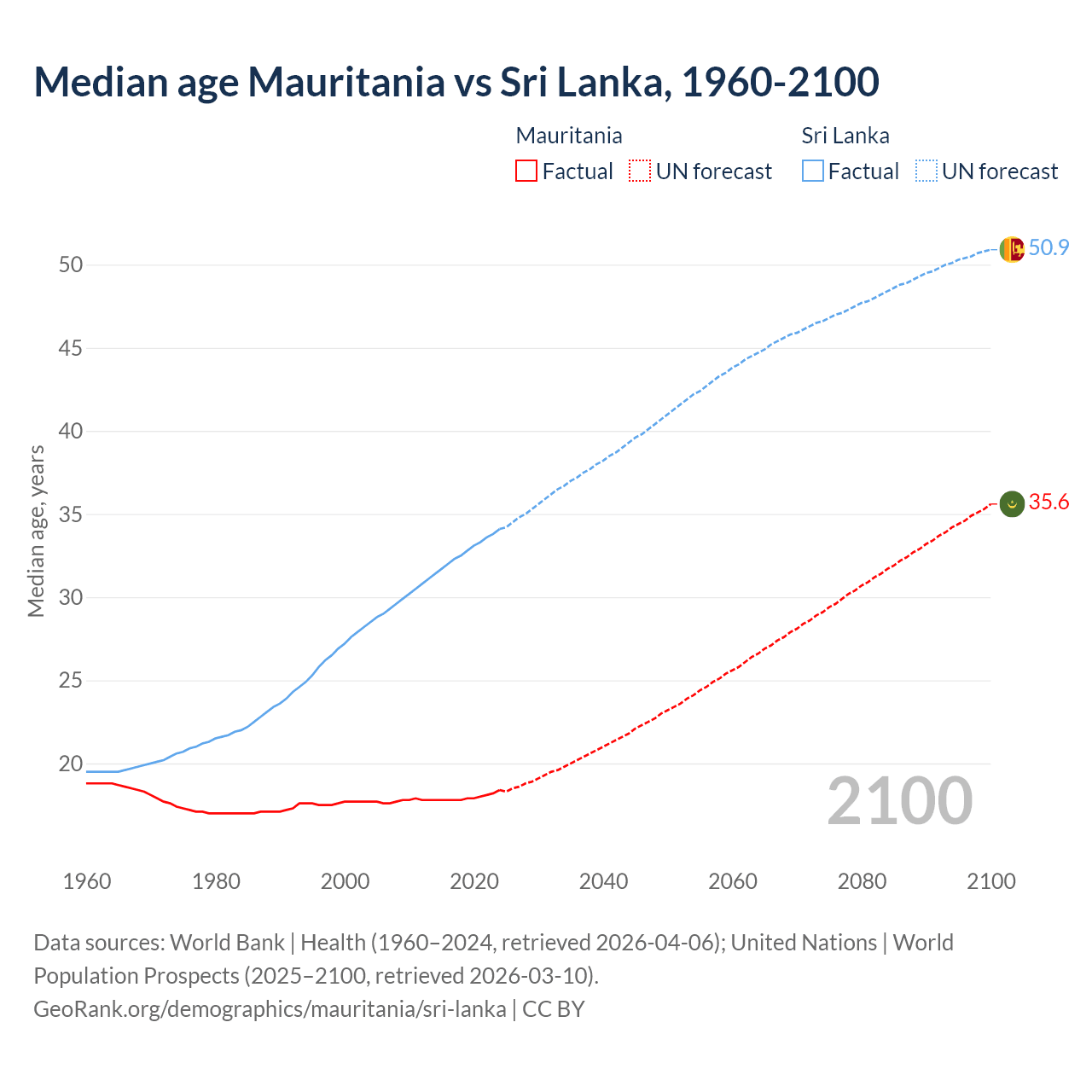 Median age Mauritania vs Sri Lanka, 1960-2100