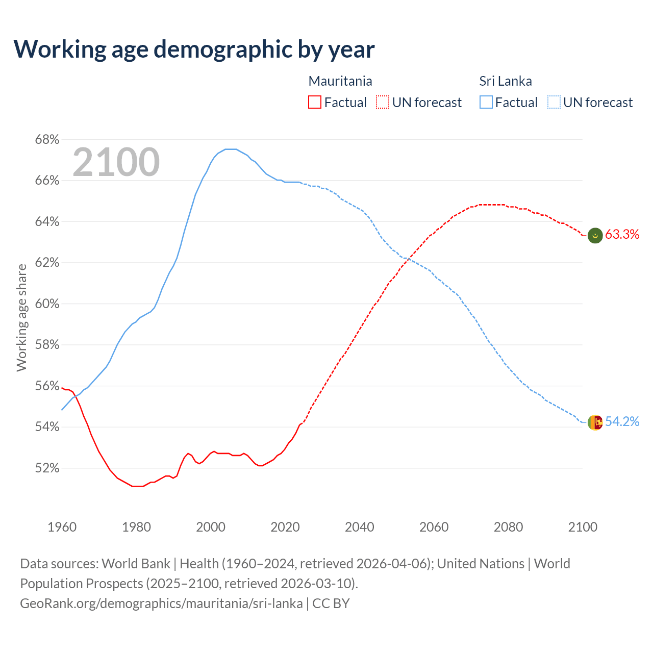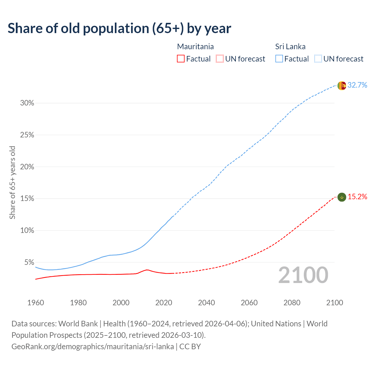 The share of older people aged 65 and over is 3.23% in Mauritania and 12.1% in Sri Lanka. Life expectancy in Mauritania compared to Sri Lanka .