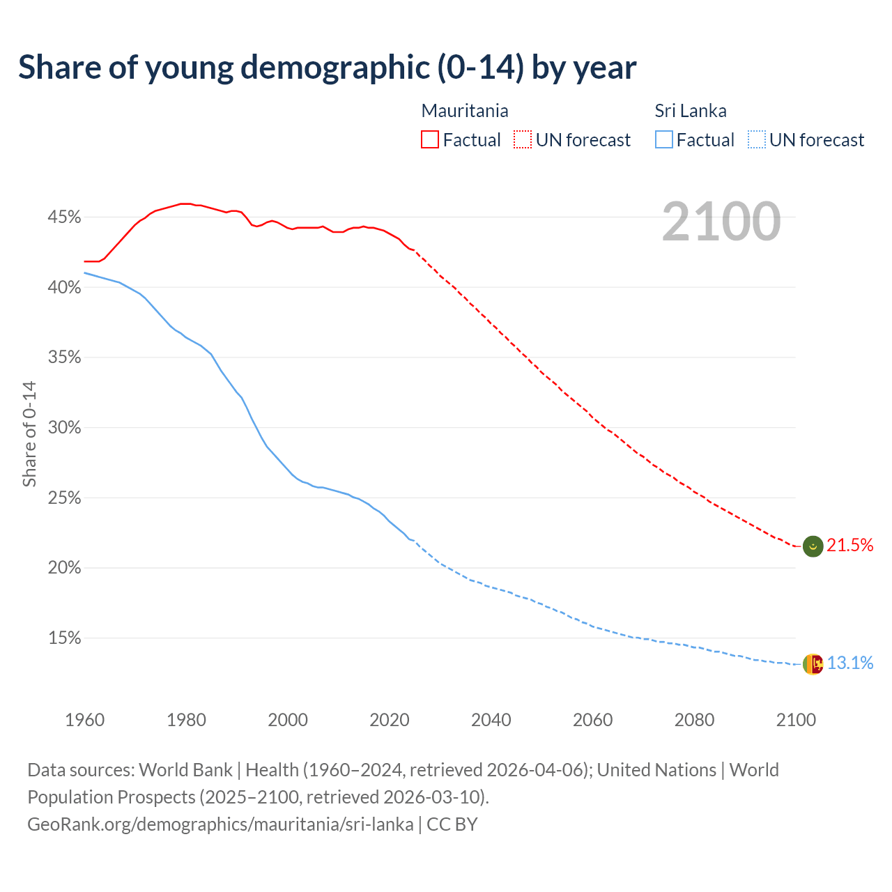 - The share of young demographic (0-15 years old) in Mauritania is 42.7% vs 22% in Sri Lanka.