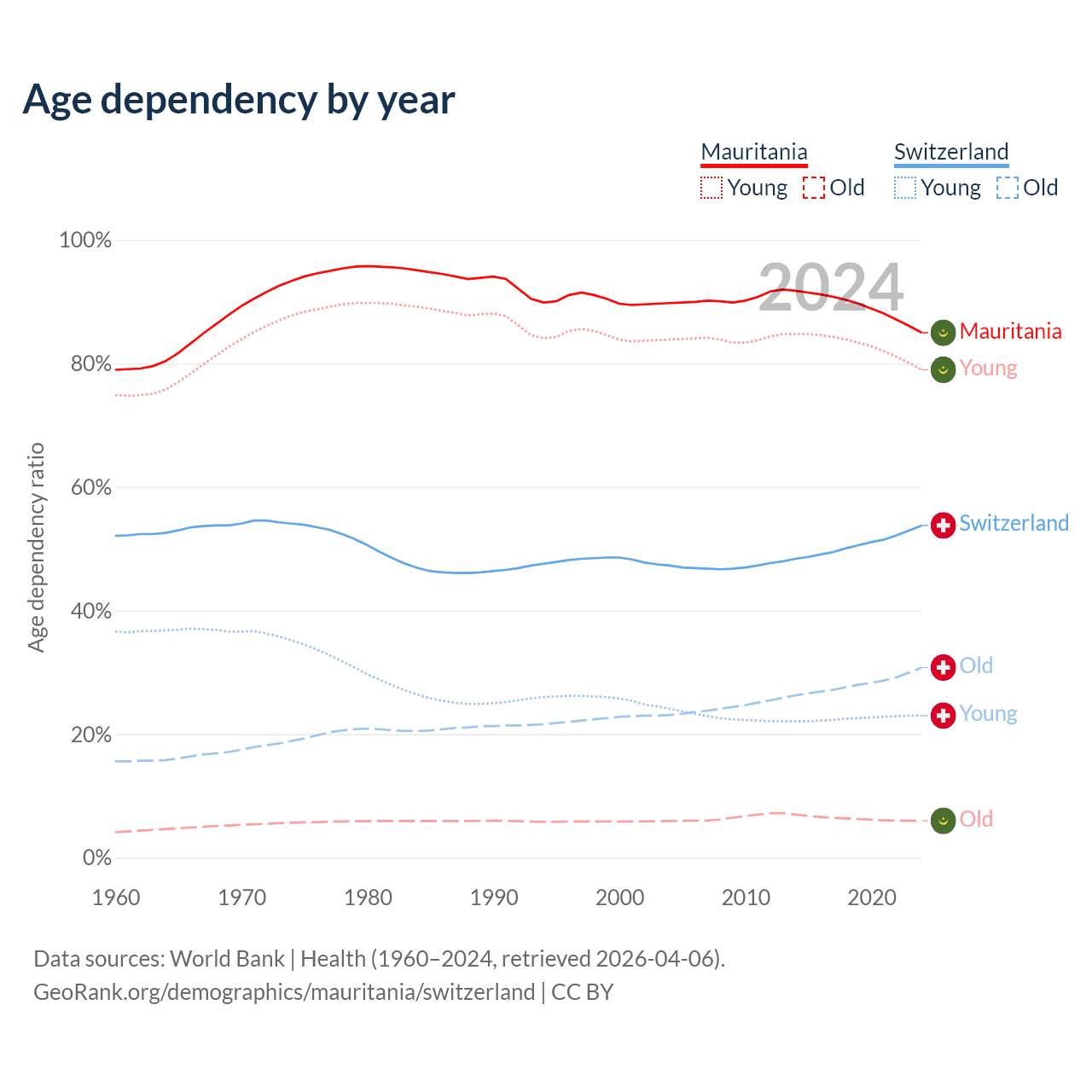 - The share of old-age demographic (65+) in Mauritania is 3.23% vs 20% in Switzerland.