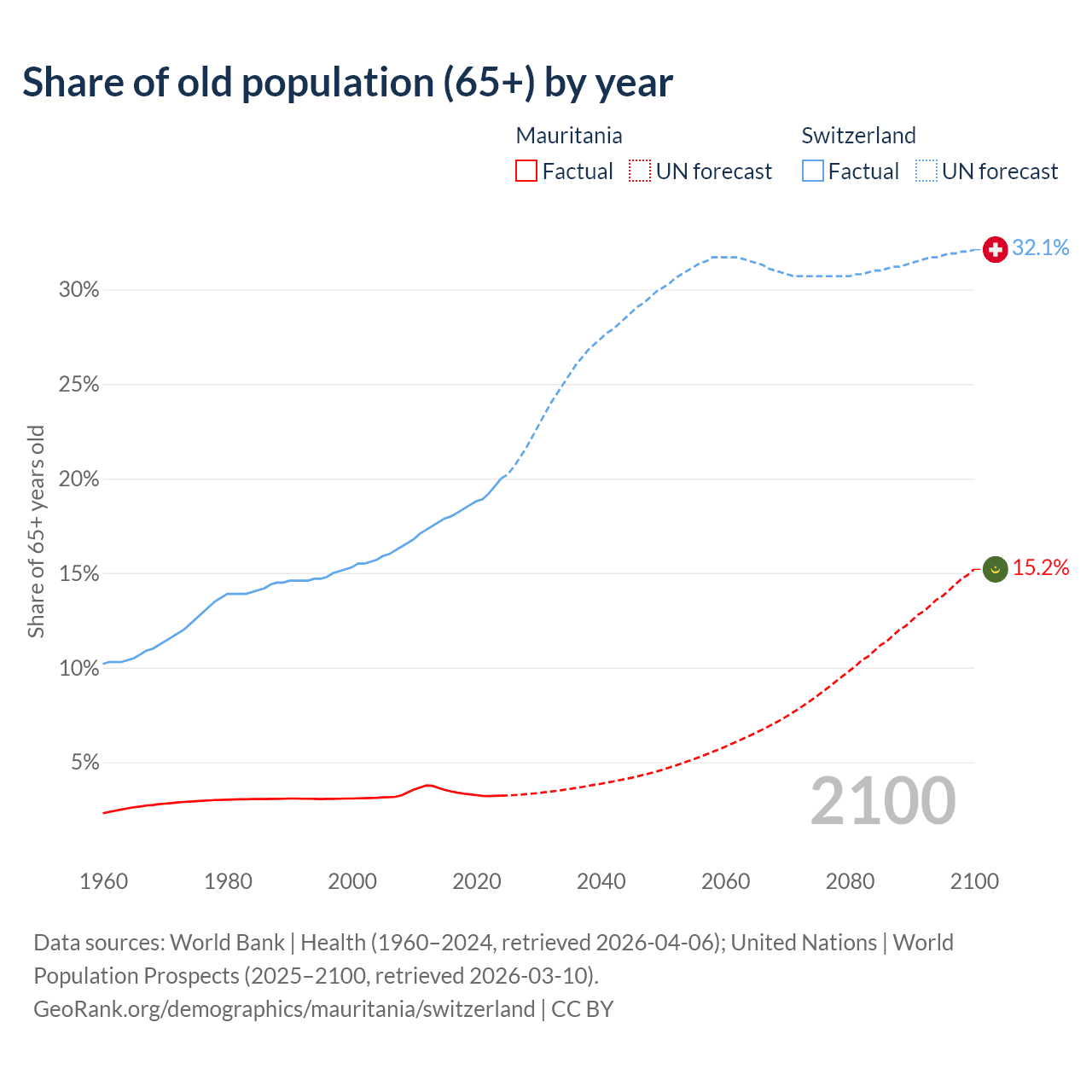 The share of older people aged 65 and over is 3.23% in Mauritania and 20% in Switzerland. Life expectancy in Mauritania compared to Switzerland .