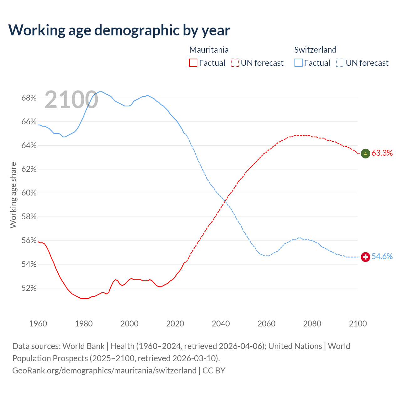 - Mauritania has 2.98M working age adults (aged 15-64) vs 5.92M in Switzerland.