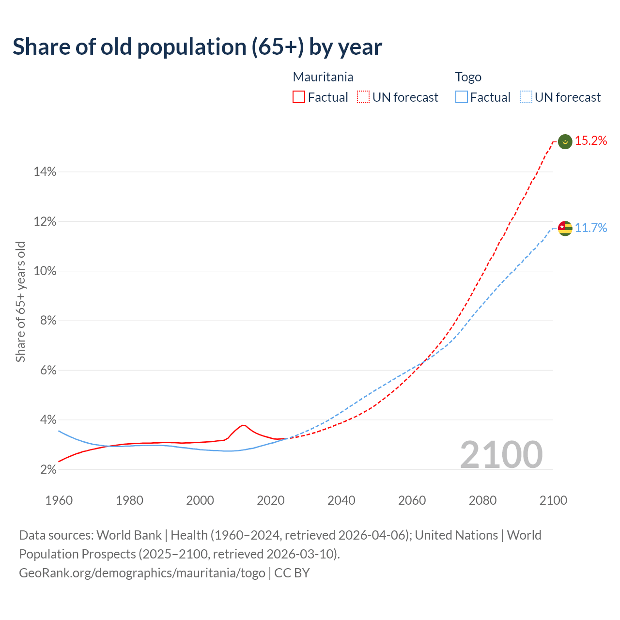 - The share of old-age demographic (65+) in Mauritania is 3.23% vs 3.21% in Togo.