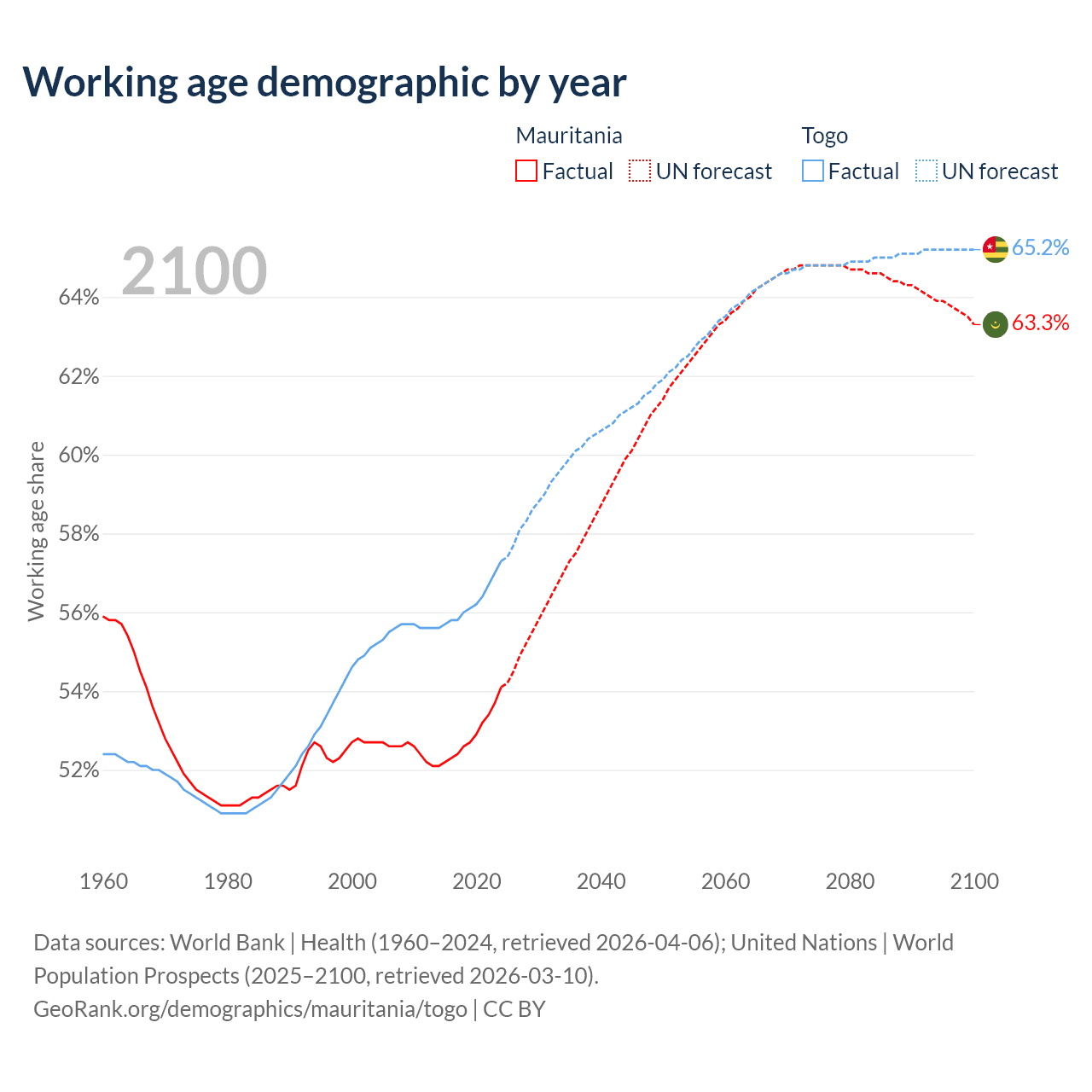 - Mauritania has 2.98M working age adults (aged 15-64) vs 5.72M in Togo.