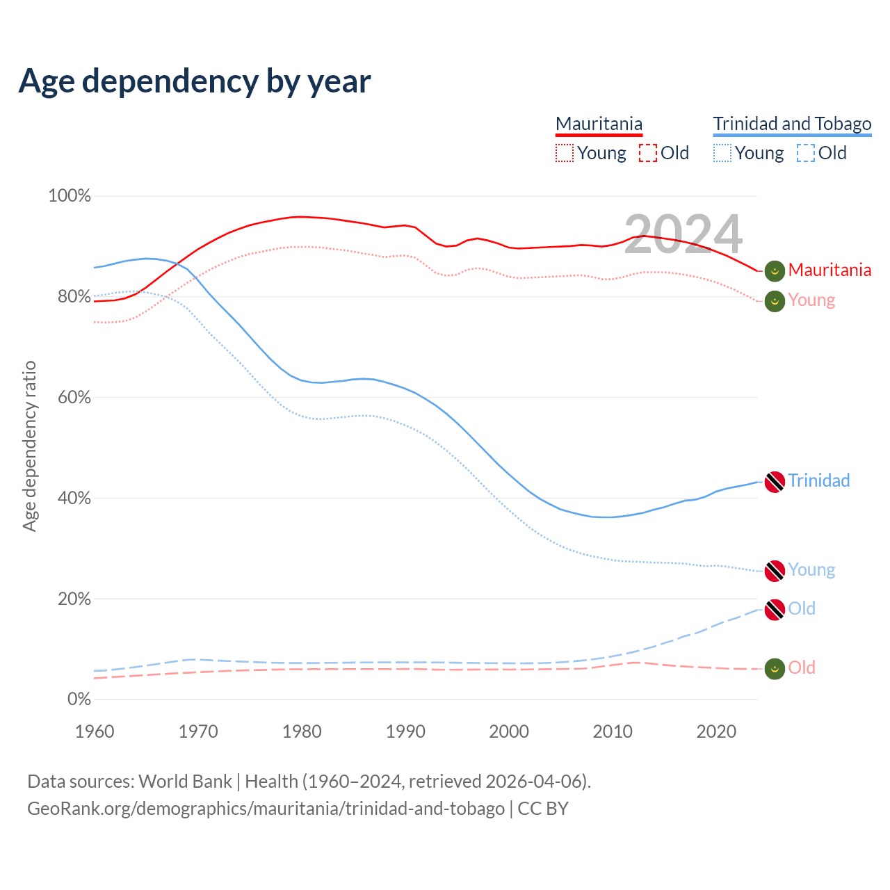 - The share of young demographic (0-15 years old) in Mauritania is 42.7% vs 17.8% in Trinidad and Tobago.