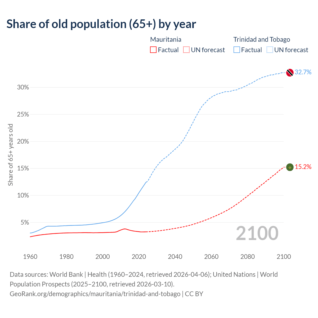 The share of older people aged 65 and over is 3.23% in Mauritania and 12.4% in Trinidad and Tobago. Life expectancy in Mauritania compared to Trinidad and Tobago .