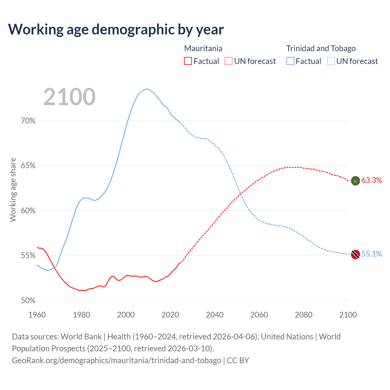 - Mauritania has 2.98M working age adults (aged 15-64) vs 960K in Trinidad and Tobago.