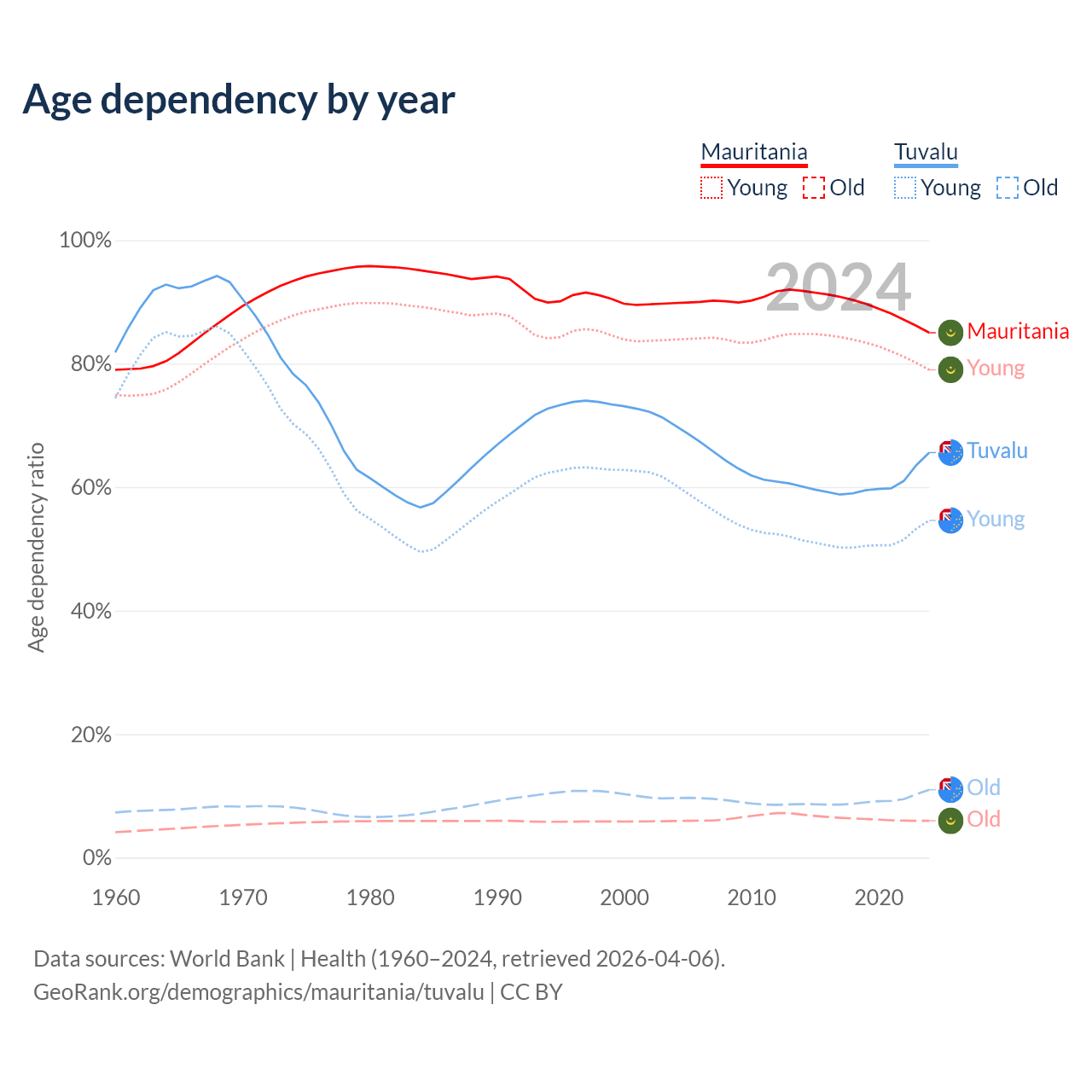 - The share of old-age demographic (65+) in Mauritania is 3.23% vs 6.67% in Tuvalu.