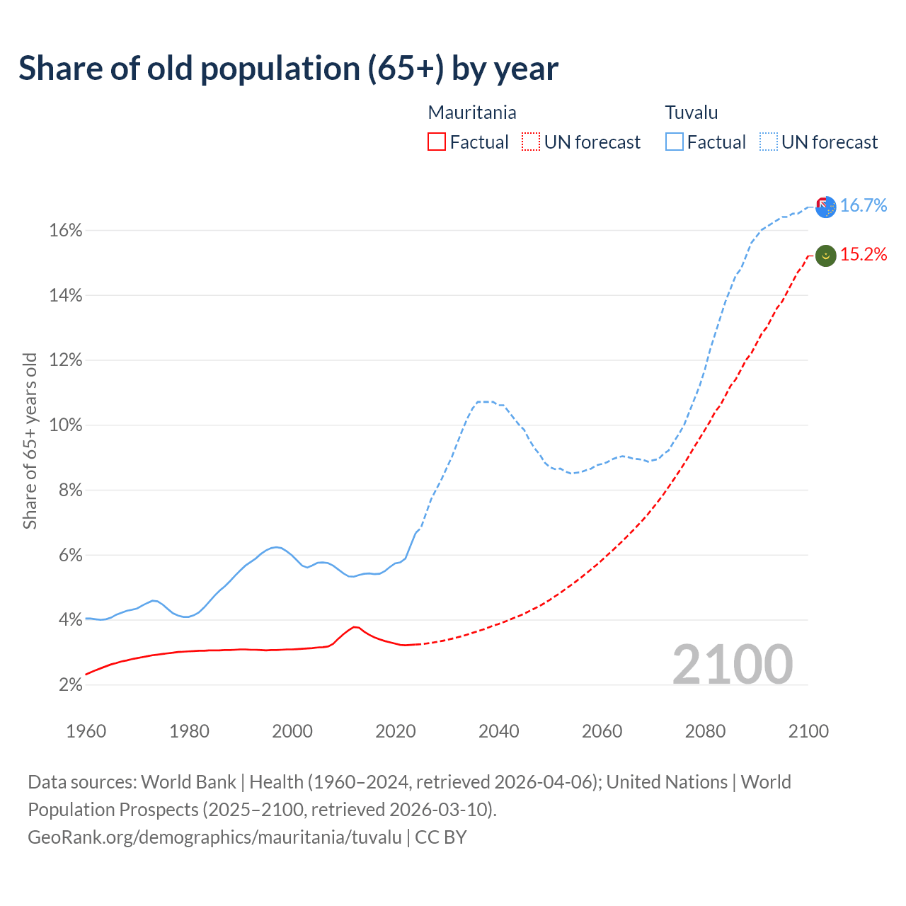 The share of older people aged 65 and over is 3.23% in Mauritania and 6.67% in Tuvalu. Life expectancy in Mauritania compared to Tuvalu .