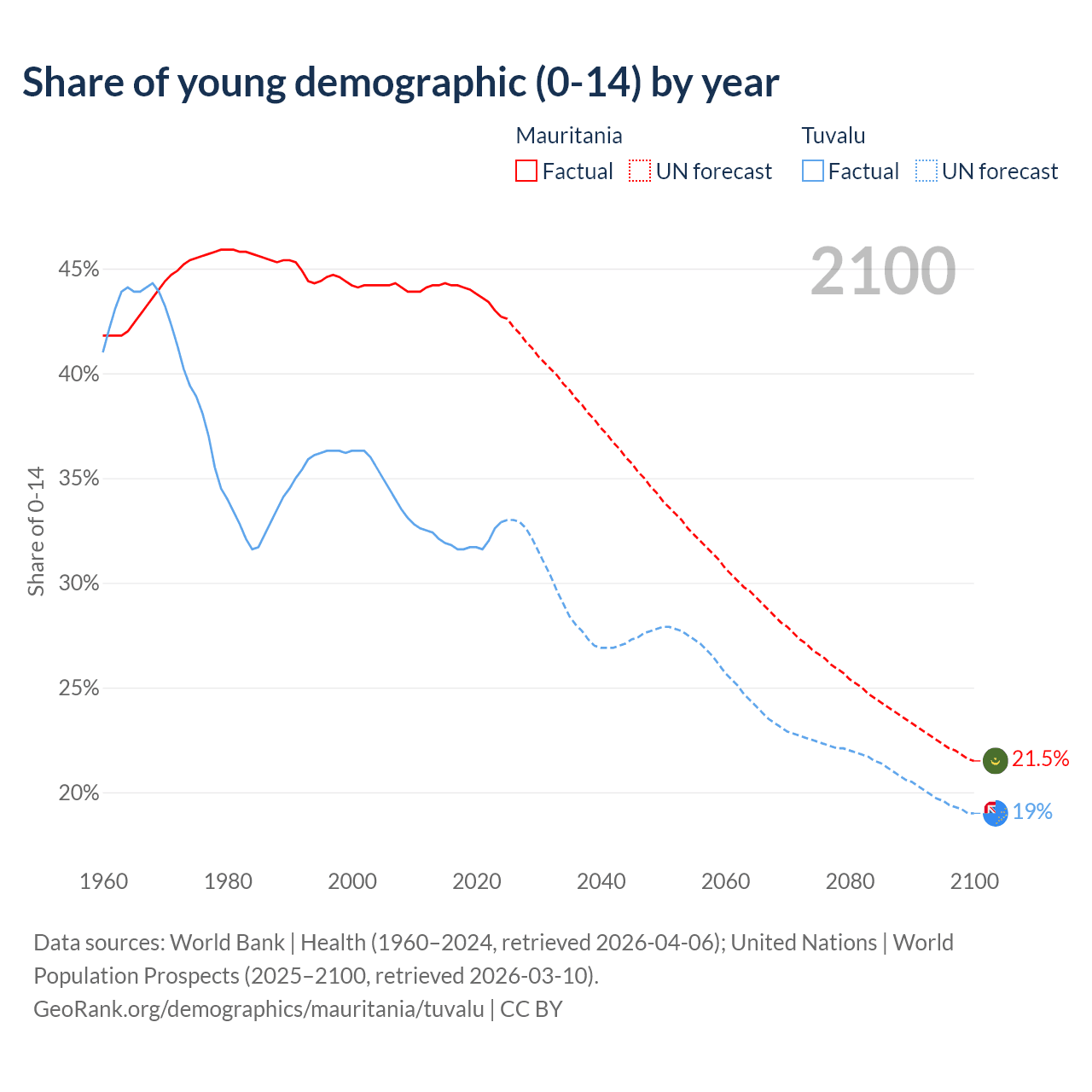 - The share of young demographic (0-15 years old) in Mauritania is 42.7% vs 32.9% in Tuvalu.