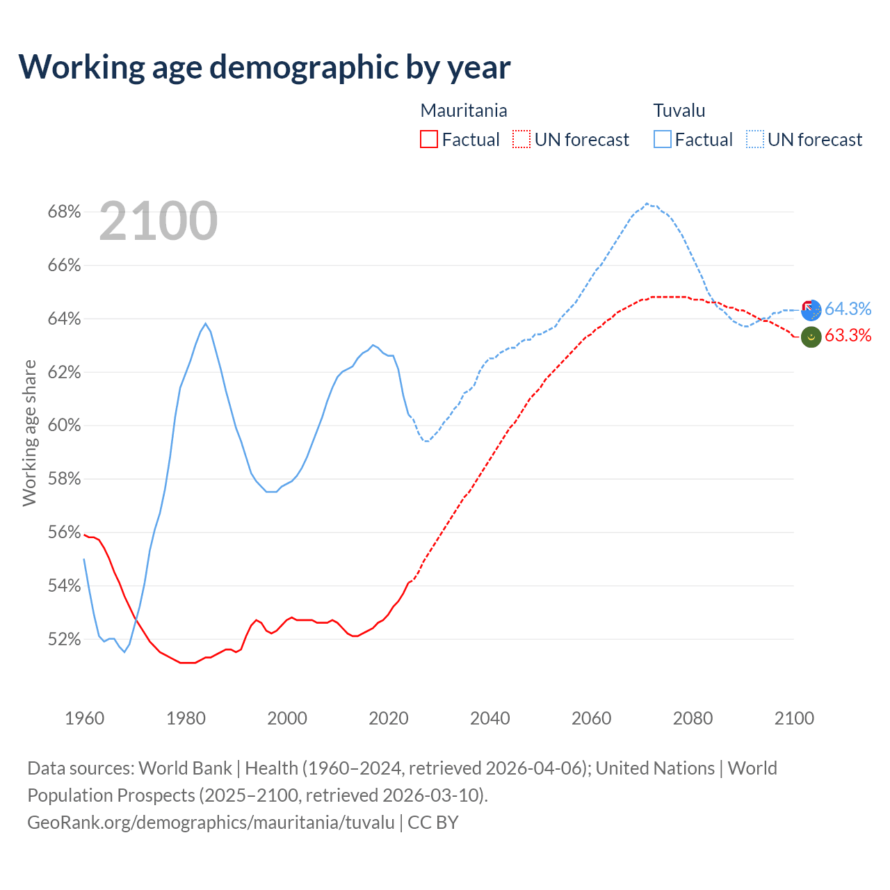 - Mauritania has 2.98M working age adults (aged 15-64) vs 5.64K in Tuvalu.
