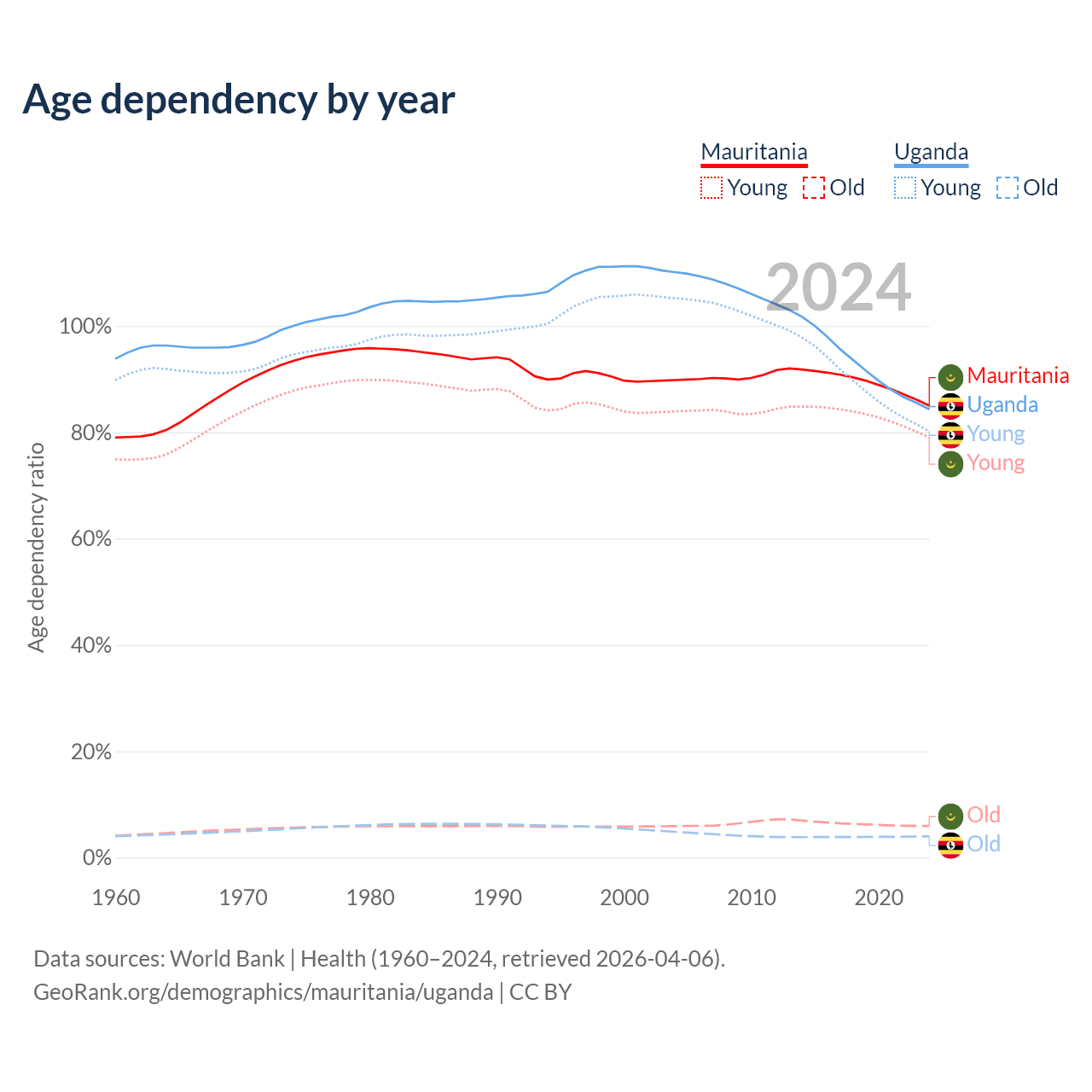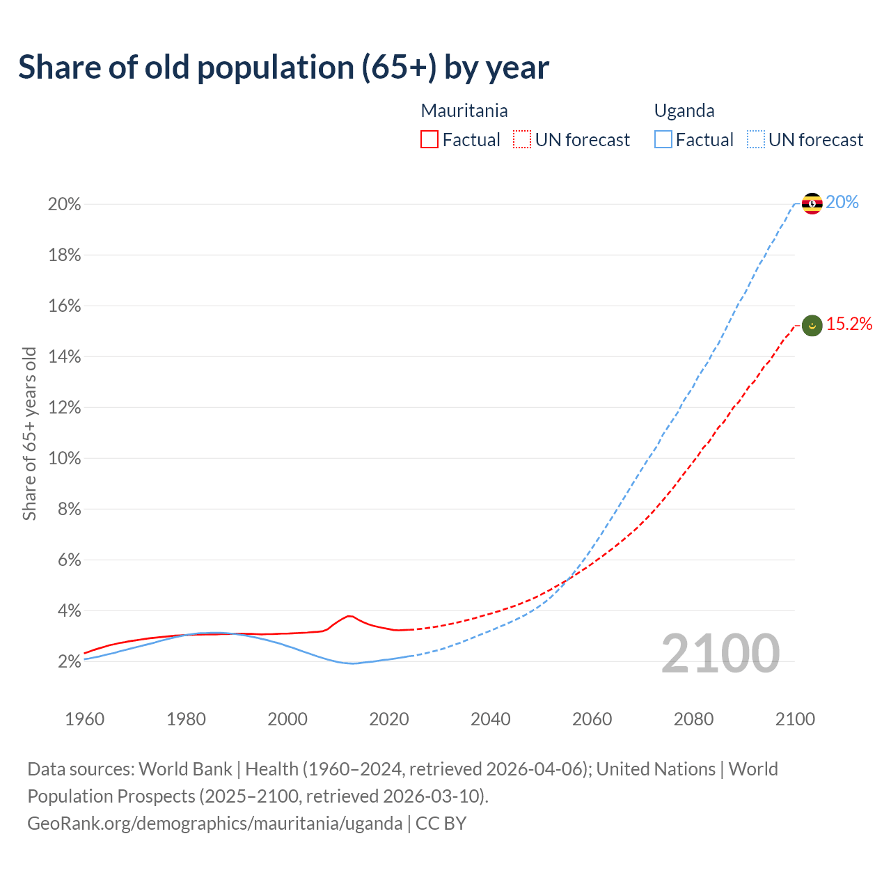 - The share of old-age demographic (65+) in Mauritania is 3.23% vs 2.19% in Uganda.
