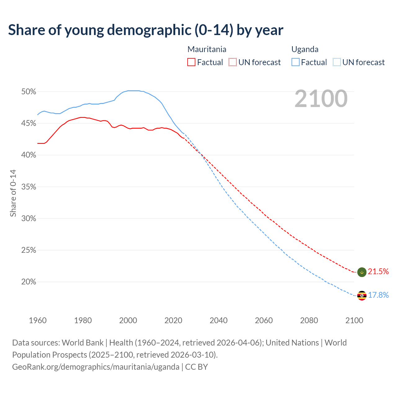 - The share of young demographic (0-15 years old) in Mauritania is 42.7% vs 43.5% in Uganda.
