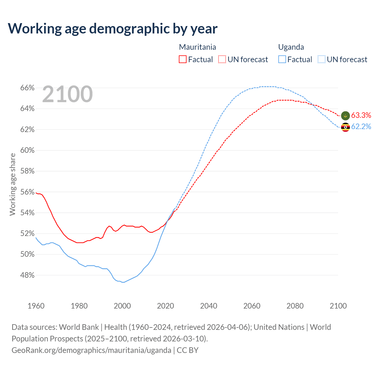 The share of older people aged 65 and over is 3.23% in Mauritania and 2.19% in Uganda. Life expectancy in Mauritania compared to Uganda .