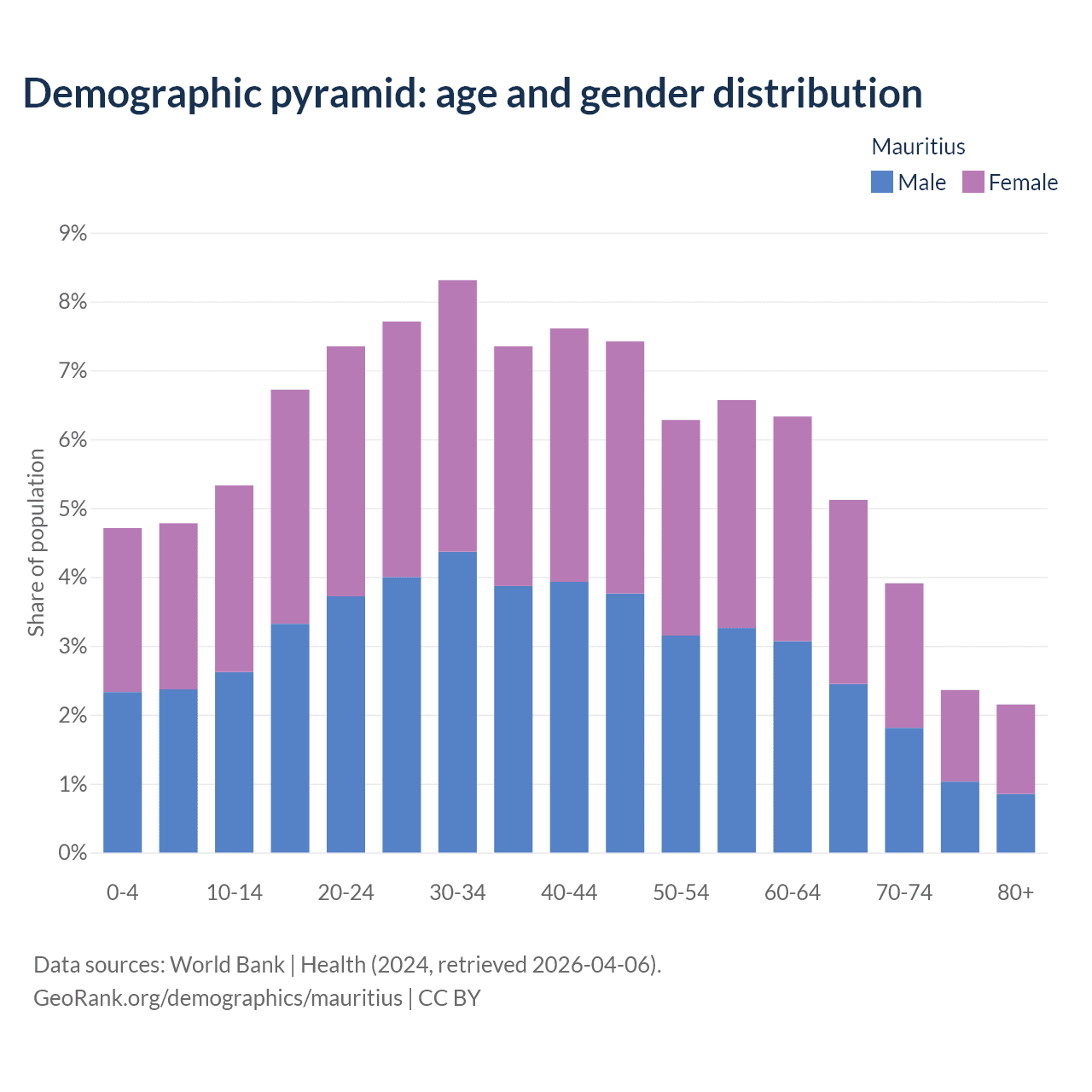 With a population of 1.25M people, Mauritius has a median age of 38.5 years which makes it the 57/196 oldest country. 14.8% of the demographic are children 0-14 years old, 71.7% are working-age people aged 15-64, and 13.5% are older population aged 65+ years.