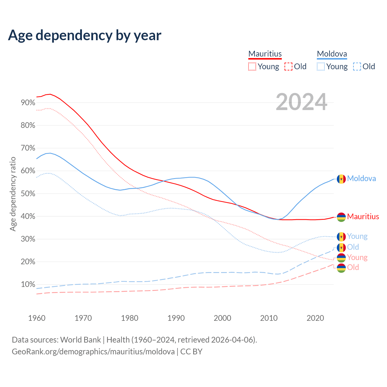 - Mauritius is ranked 57/196 by median age (oldest to youngest) vs 54/196 for Moldova.