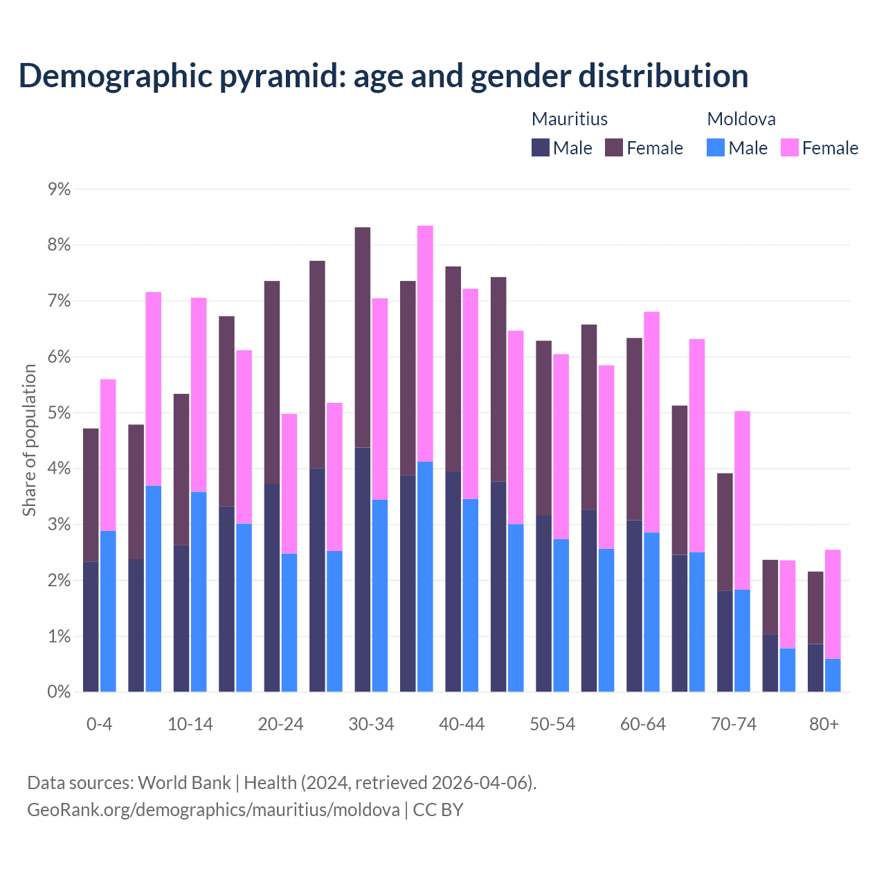- The median age in Mauritius is 38.5 years compared to 39.1 years in Moldova.