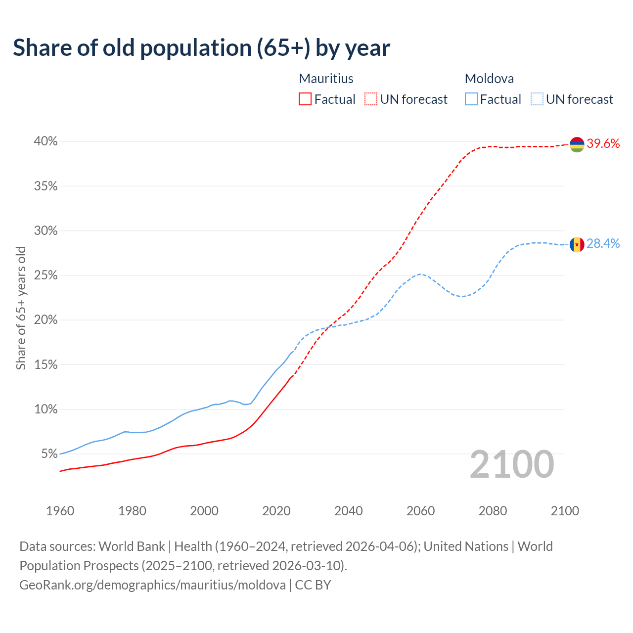 The share of older people aged 65 and over is 13.5% in Mauritius and 16.2% in Moldova. Life expectancy in Mauritius compared to Moldova .