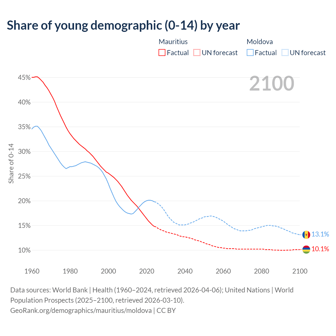 - The share of young demographic (0-15 years old) in Mauritius is 14.8% vs 19.8% in Moldova.