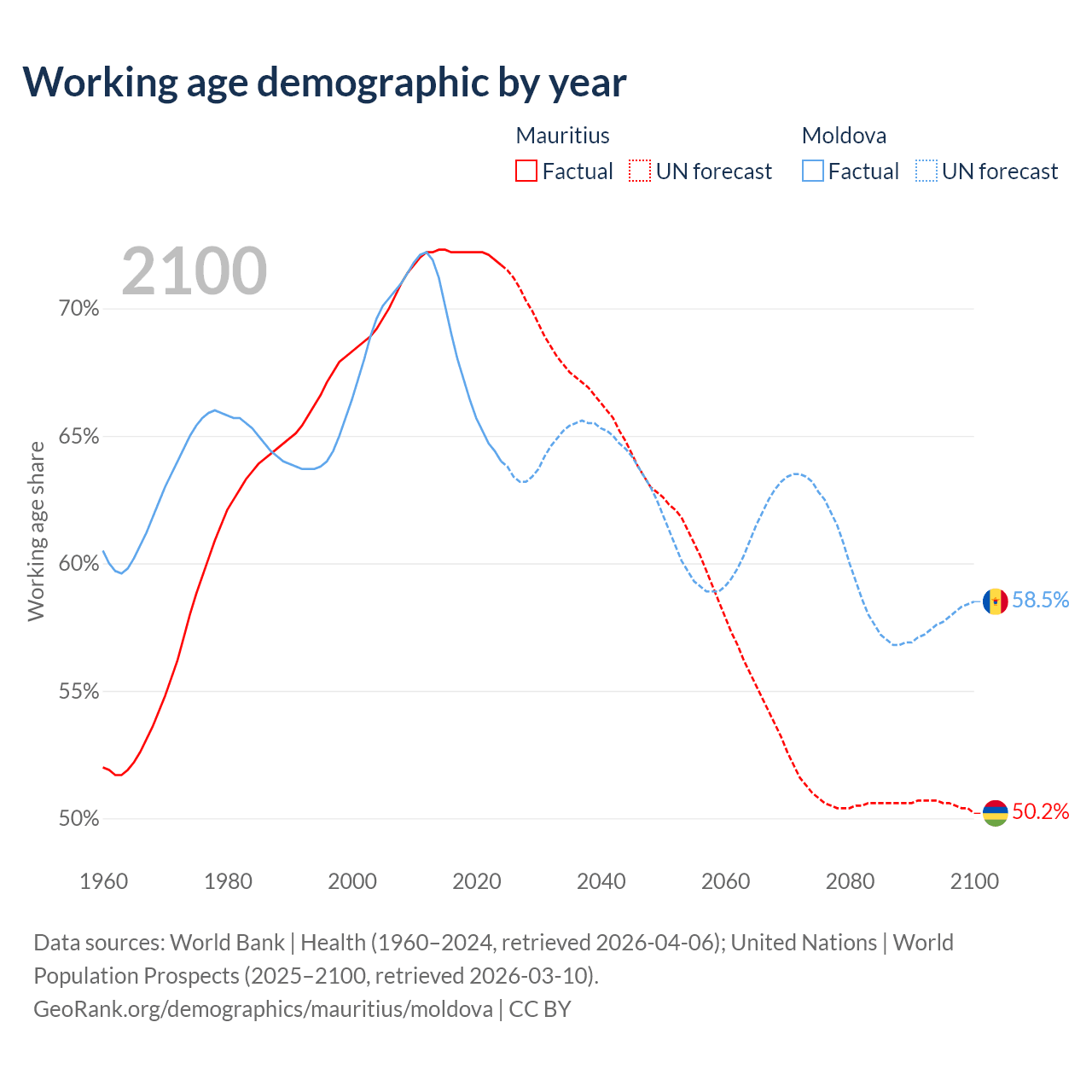 Median age Mauritius vs Moldova, 1960-2100