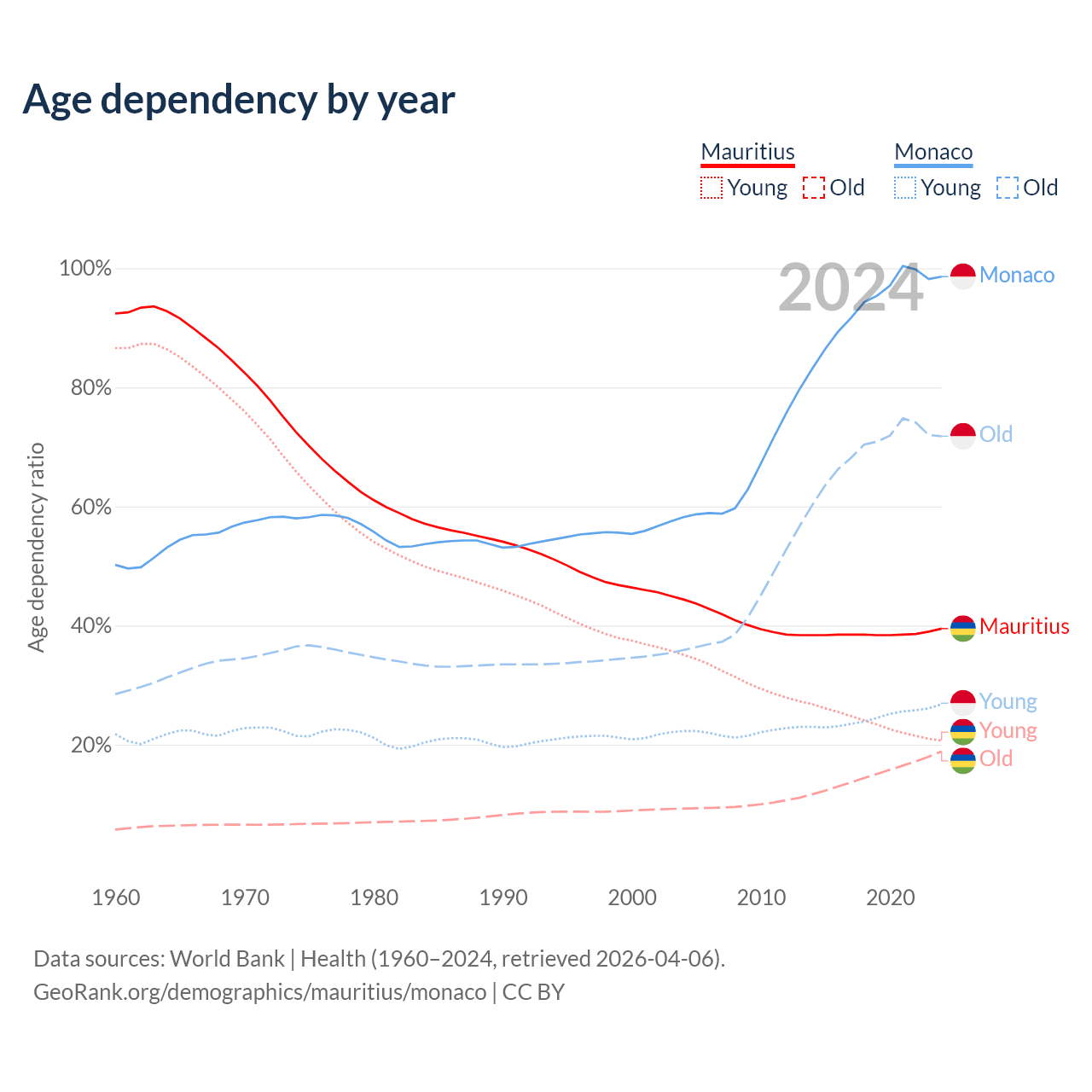 - Mauritius is ranked 57/196 by median age (oldest to youngest) vs 1/196 for Monaco.