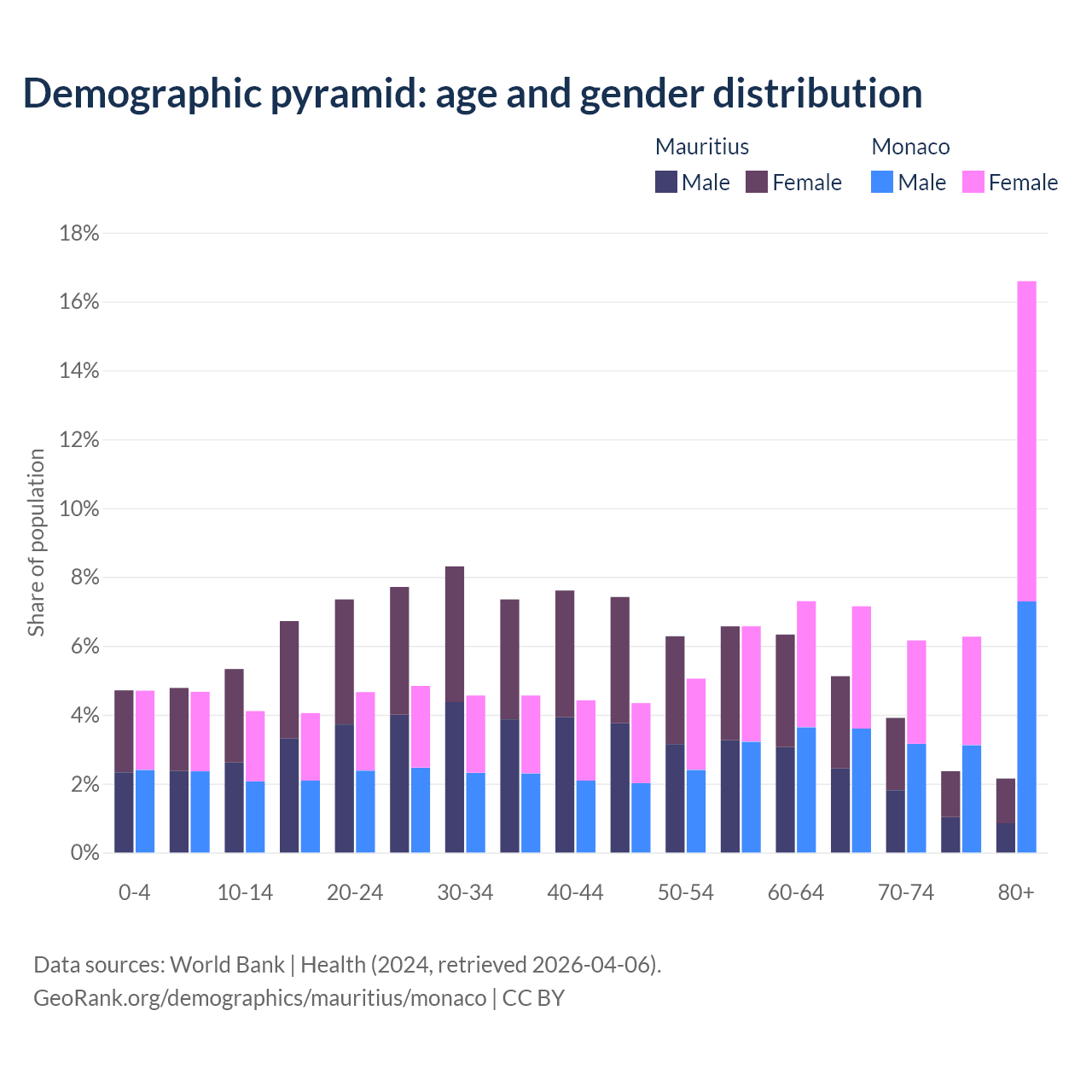 The share of older people aged 65 and over is 13.5% in Mauritius and 36.2% in Monaco. Life expectancy in Mauritius compared to Monaco .
