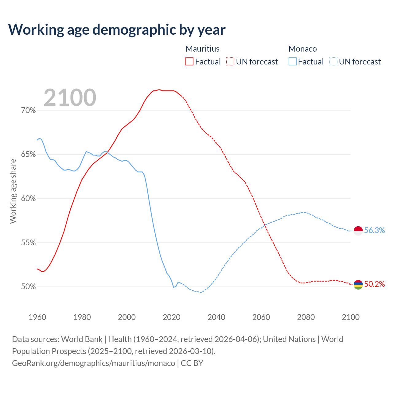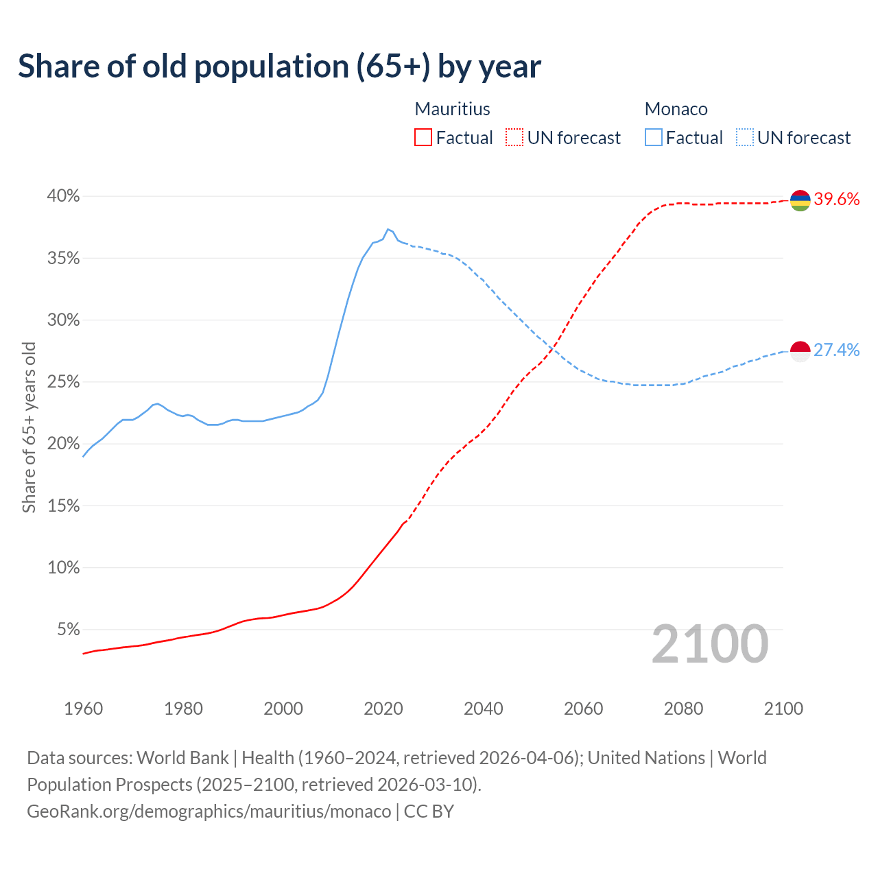 Median age Mauritius vs Monaco, 1960-2100