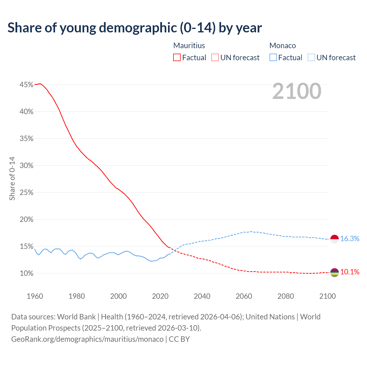 - The share of young demographic (0-15 years old) in Mauritius is 14.8% vs 13.5% in Monaco.