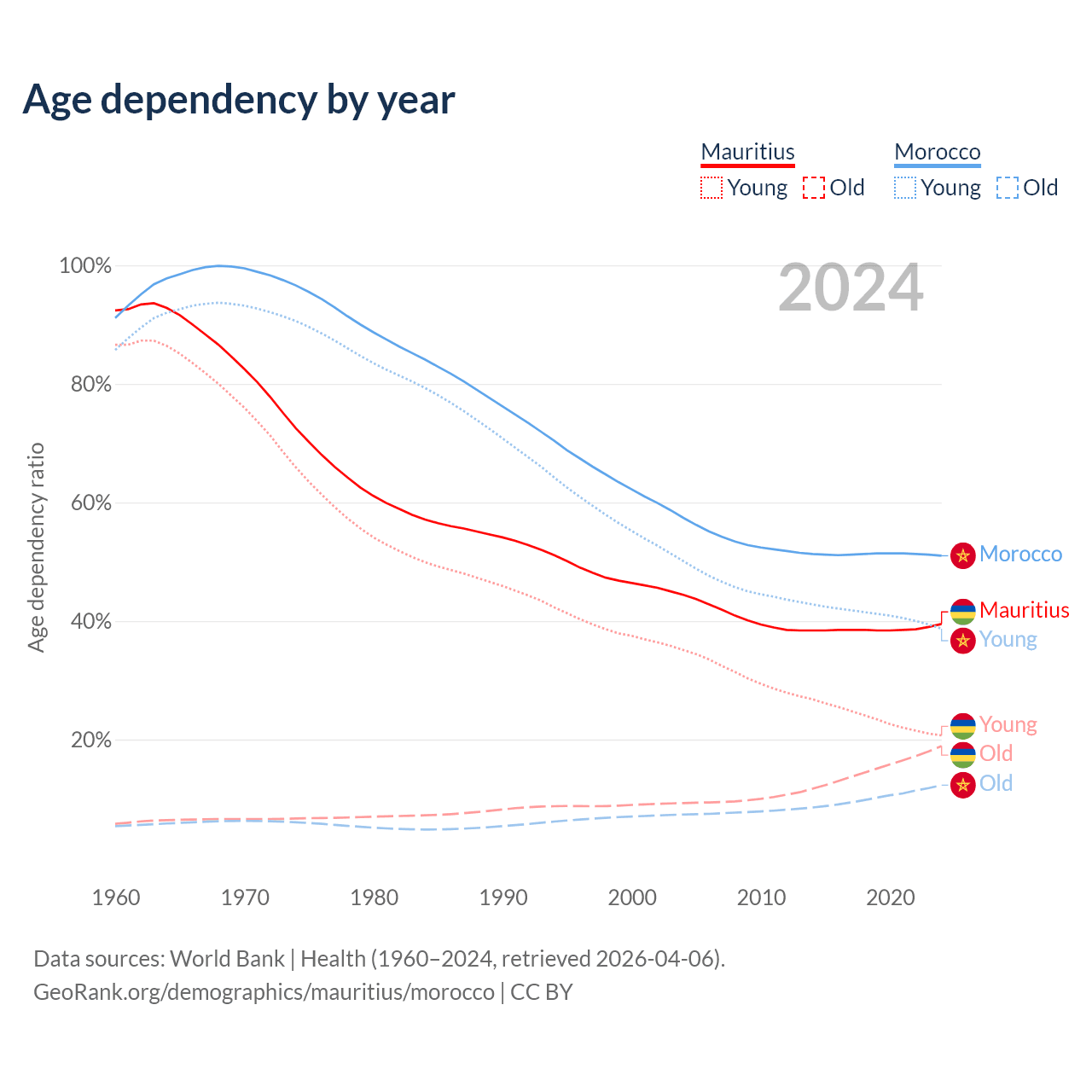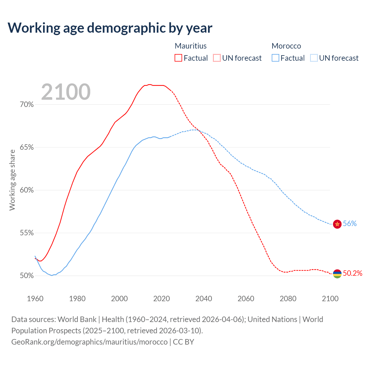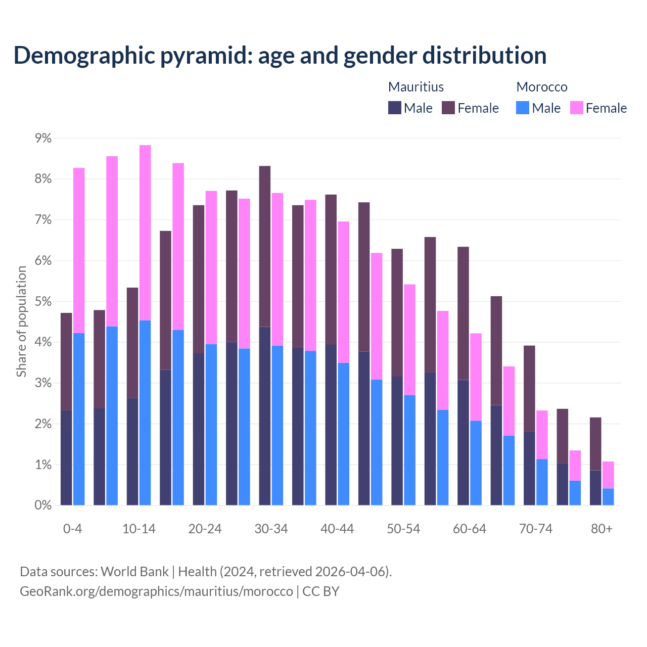 - Mauritius is ranked 57/196 by median age (oldest to youngest) vs 100/196 for Morocco.