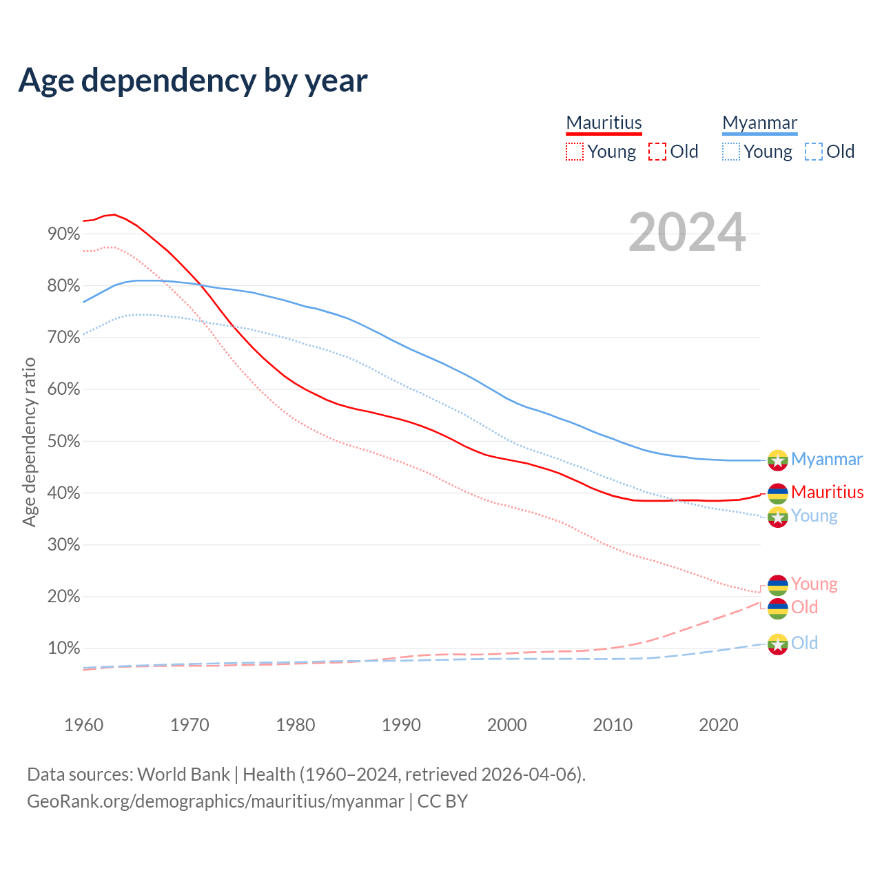 - Mauritius is ranked 57/196 by median age (oldest to youngest) vs 96/196 for Myanmar.
