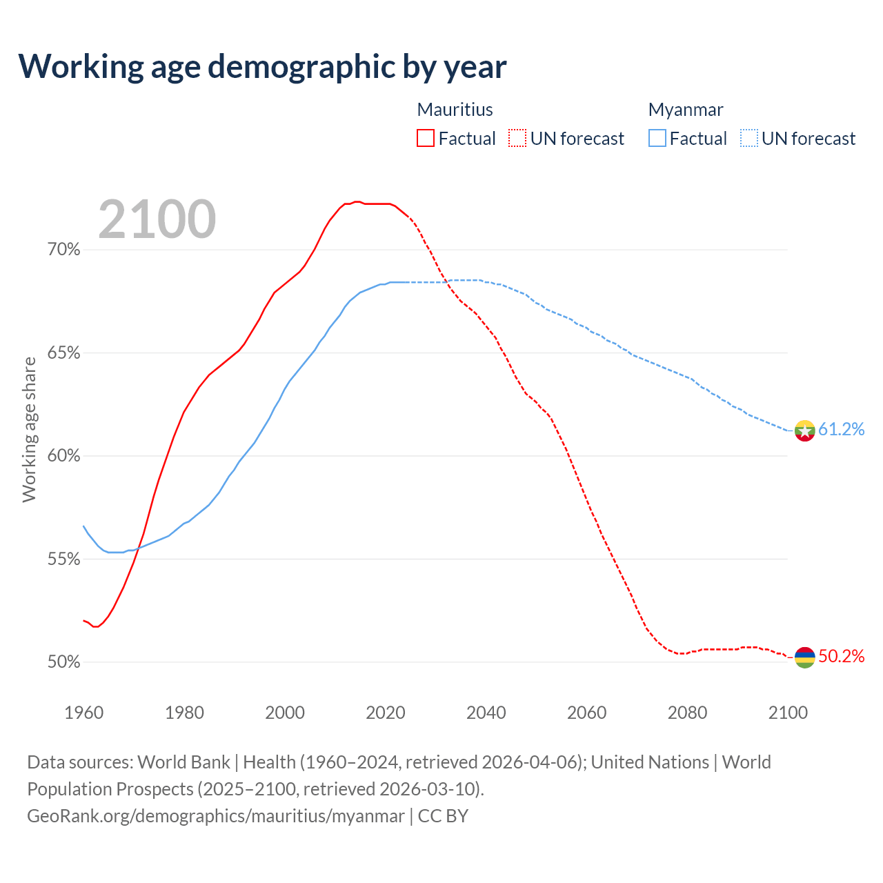 Median age Mauritius vs Myanmar, 1960-2100