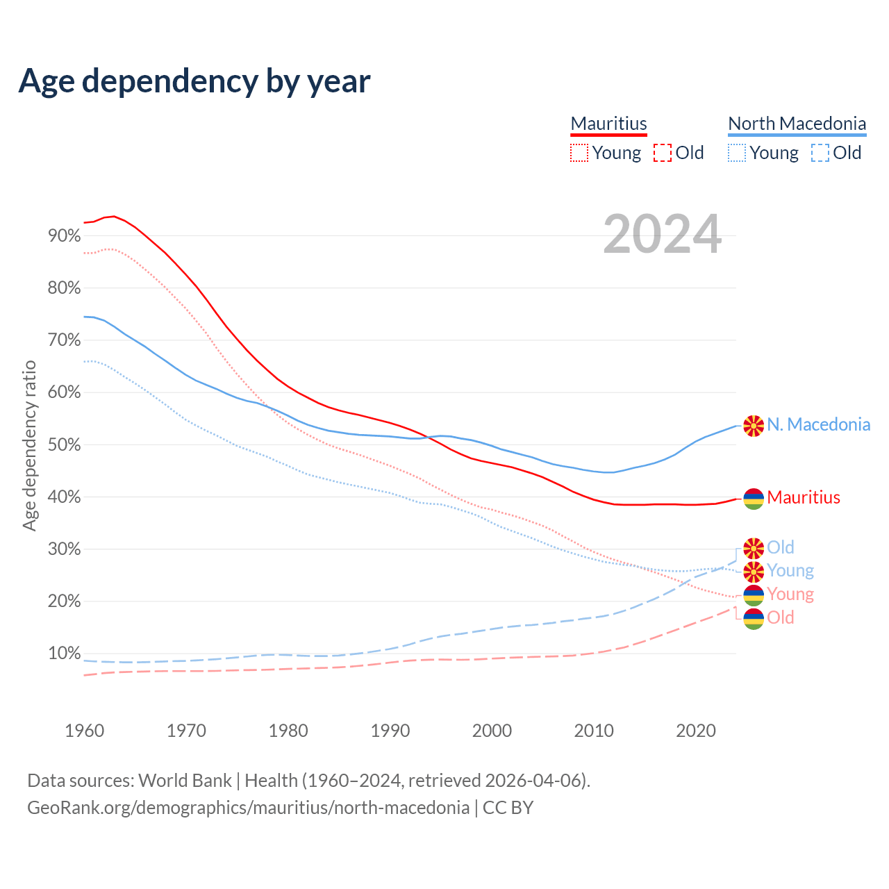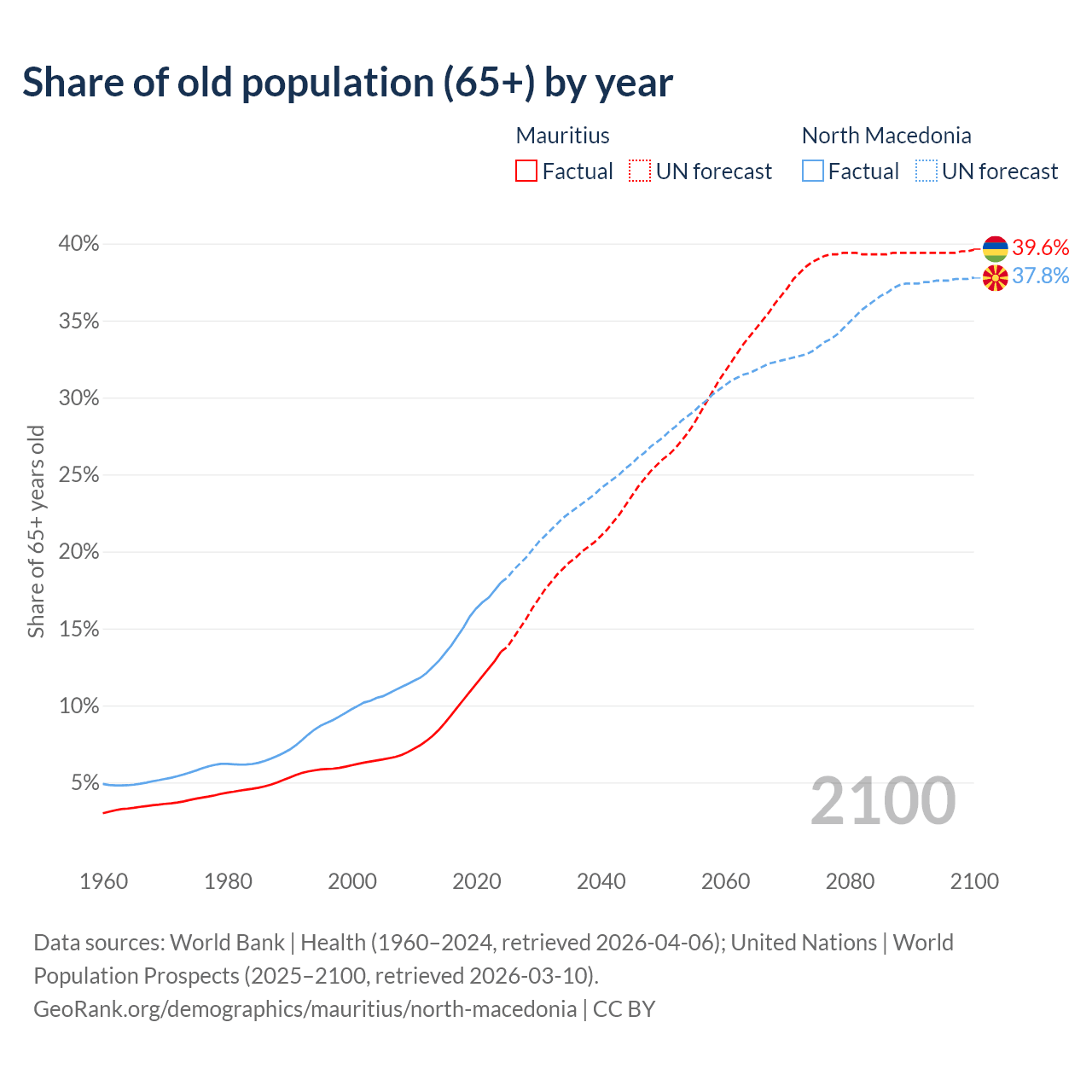 The share of older people aged 65 and over is 13.5% in Mauritius and 18% in North Macedonia. Life expectancy in Mauritius compared to North Macedonia .